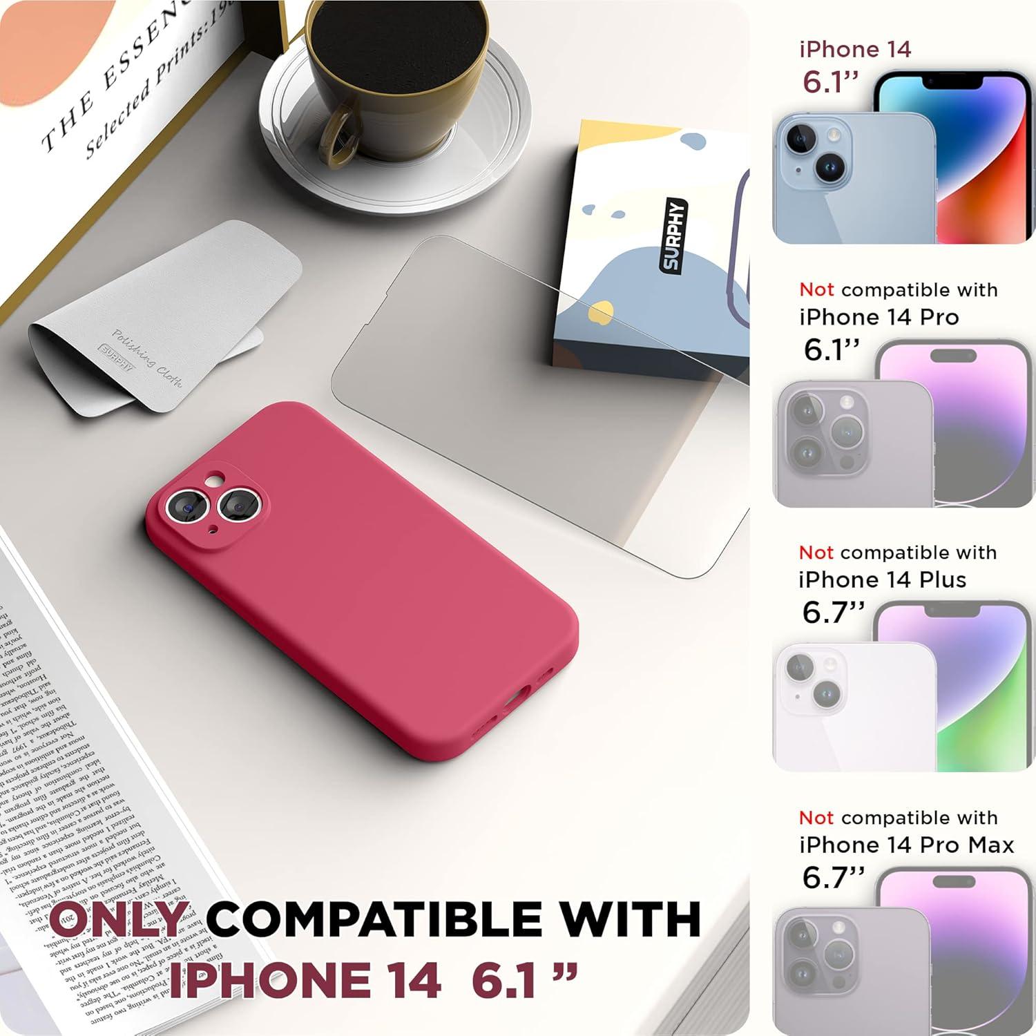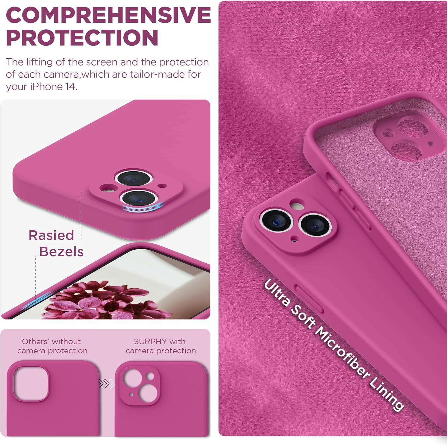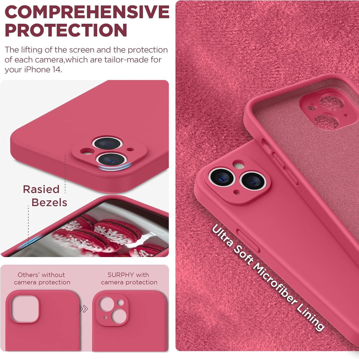 SURPHY Compatible with iPhone 14 Case with Screen Protector (Camera Protection & Soft Microfiber Lining) Liquid Silicone Phone Case 6.1 inch 2022, Red(Hot Pink)