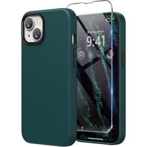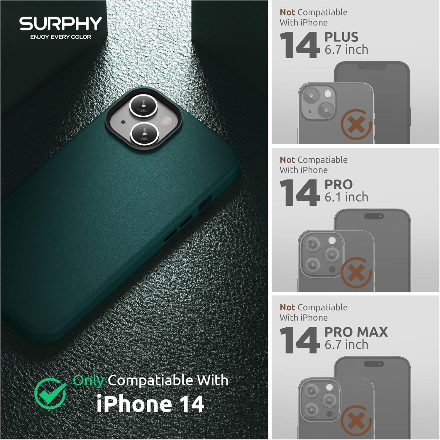 SURPHY Designed for Faux Leather iPhone 14 Case with Screen Protector (6.1 inch), Metallic Buttons & Microfiber Lining Leather Phone Case for 14, Brown(Forest Green)