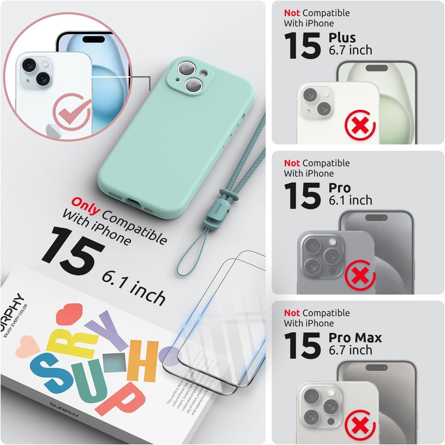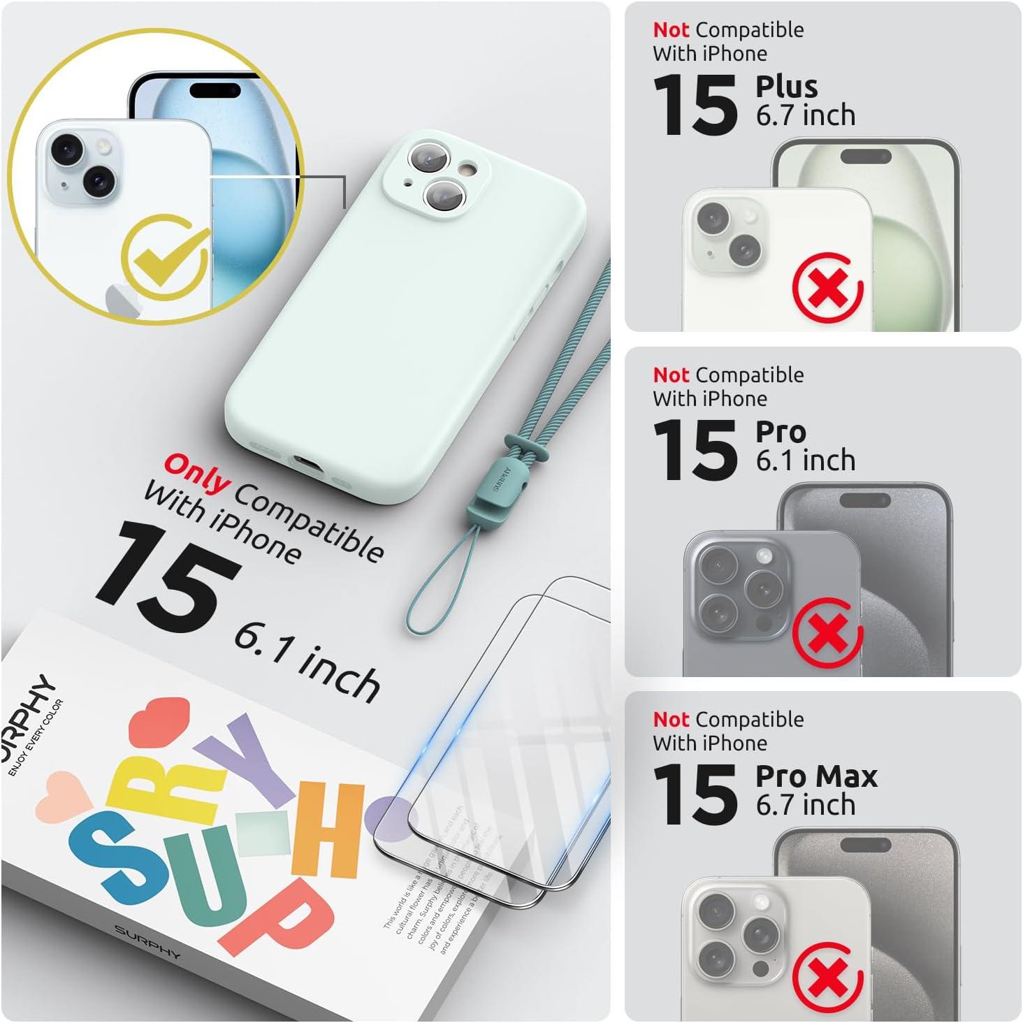 SURPHY Designed for iPhone 15 Case with Screen Protector and Lanyard, Phone Strap and Liquid Silicone Phone Case (Camera Protective & Soft Microfiber Lining) 6.1 inch 2023, Lilac Purple(Soft Mint)