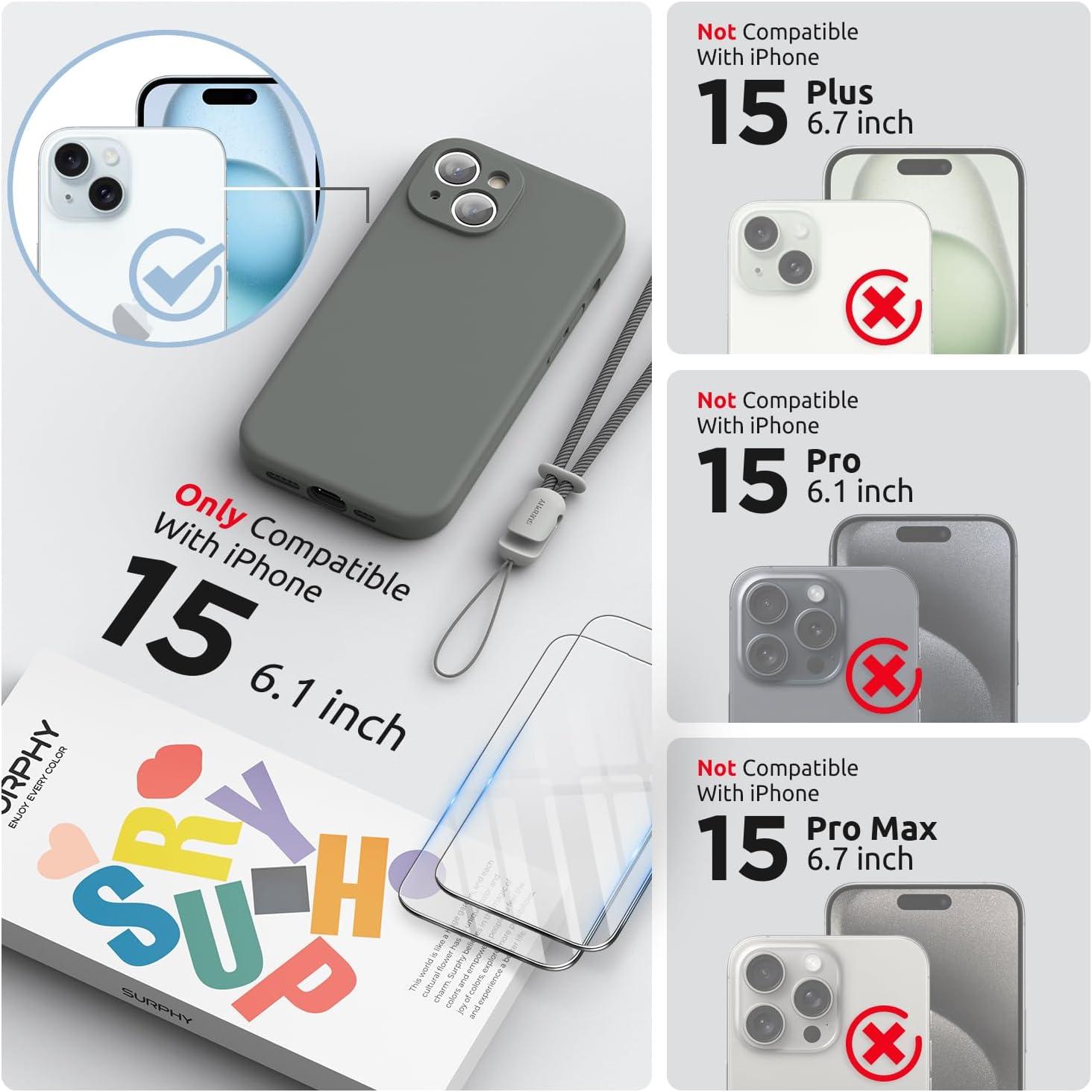 SURPHY Designed for iPhone 15 Case with Screen Protector and Lanyard, Phone Strap and Liquid Silicone Phone Case (Camera Protective & Soft Microfiber Lining) 6.1 inch 2023, Lilac Purple(Space Gray)