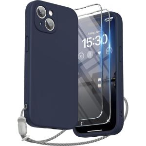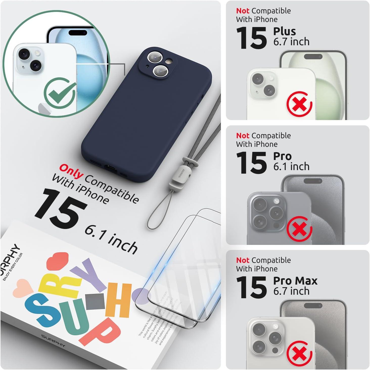 SURPHY Designed for iPhone 15 Case with Screen Protector and Lanyard, Phone Strap and Liquid Silicone Phone Case (Camera Protective & Soft Microfiber Lining) 6.1 inch 2023, Lilac Purple(Midnight Blue)