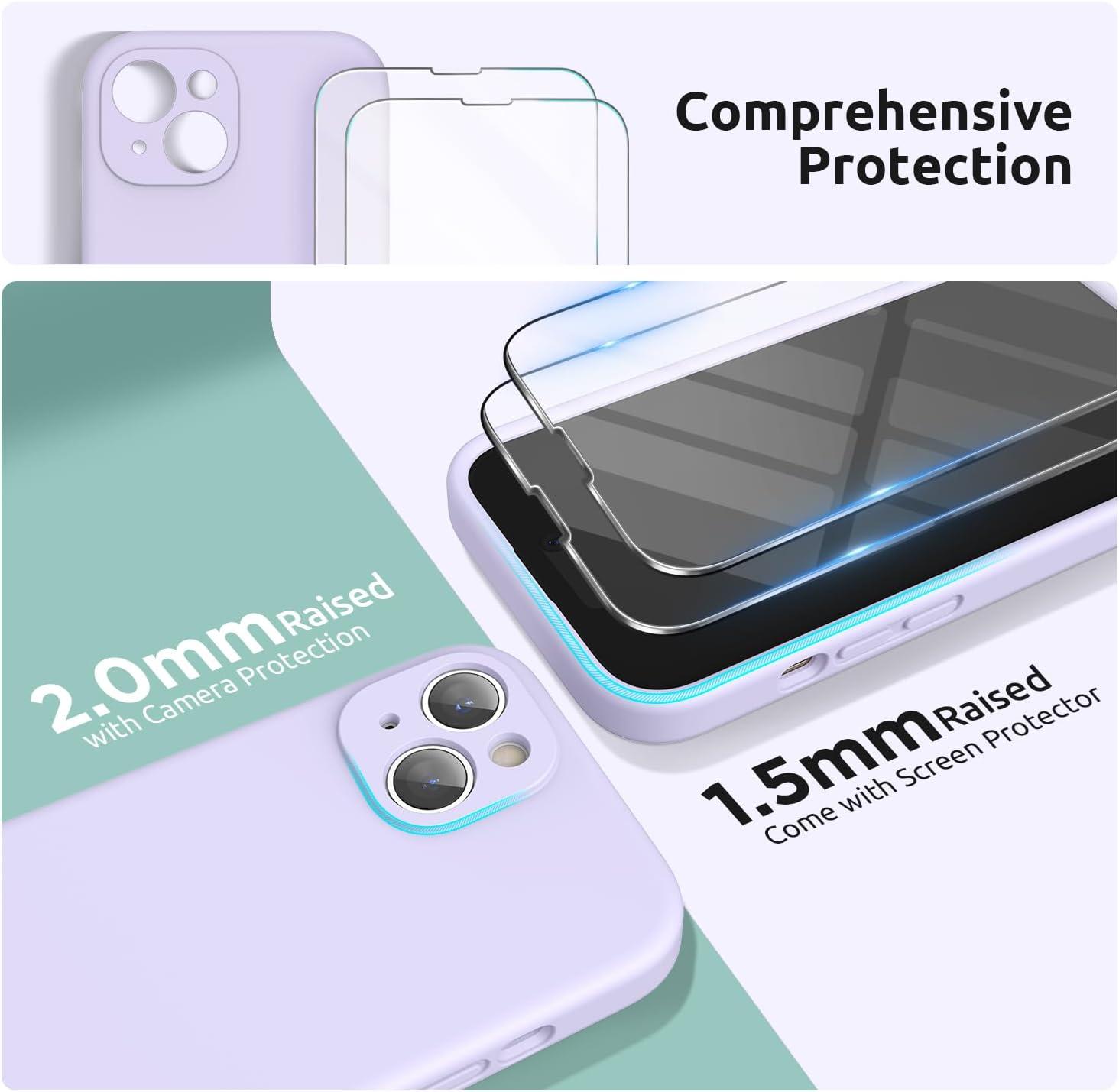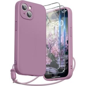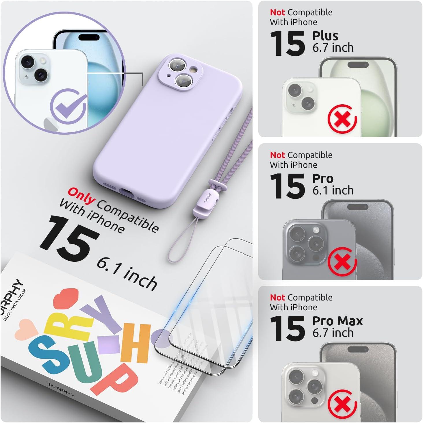 SURPHY Designed for iPhone 15 Case with Screen Protector and Lanyard, Phone Strap and Liquid Silicone Phone Case (Camera Protective & Soft Microfiber Lining) 6.1 inch 2023, Lilac Purple(Lilac)