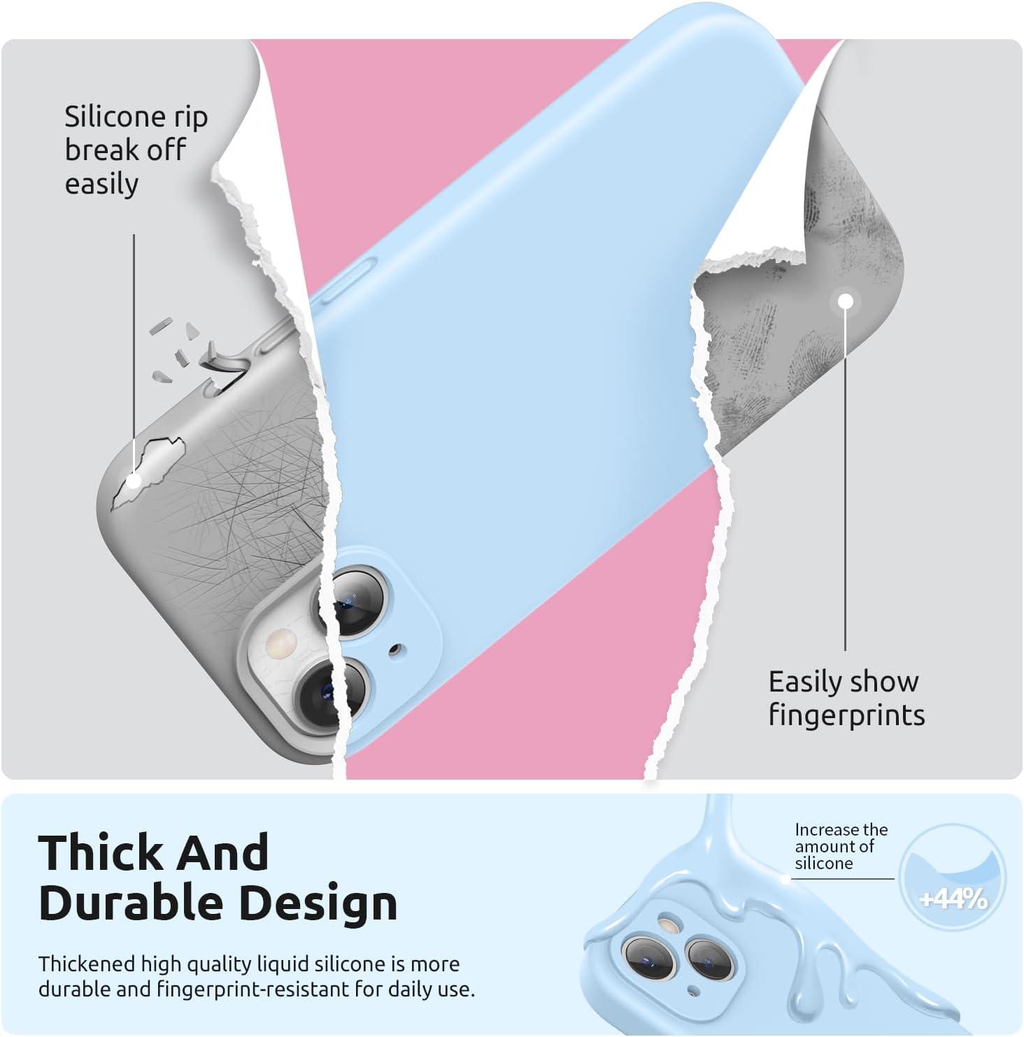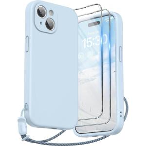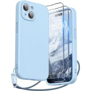 SURPHY Designed for iPhone 15 Case with Screen Protector and Lanyard, Phone Strap and Liquid Silicone Phone Case (Camera Protective & Soft Microfiber Lining) 6.1 inch 2023, Lilac Purple(Light Blue)