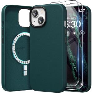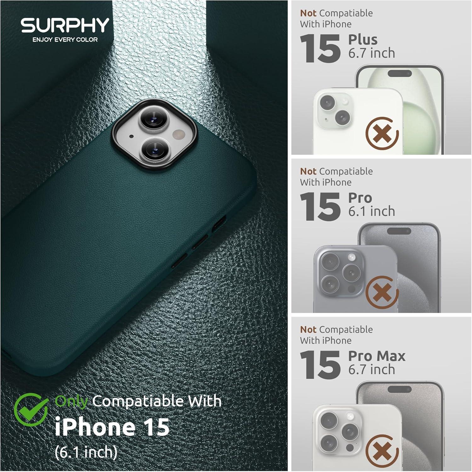 SURPHY Designed for iPhone 15 Leather Case with Screen Protector Compatible with MagSafe, Faux Leather Case (Metallic Buttons & Microfiber Lining) for 15 6.1 inch 2023, Brown(Forest Green)