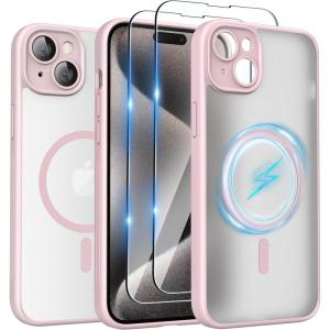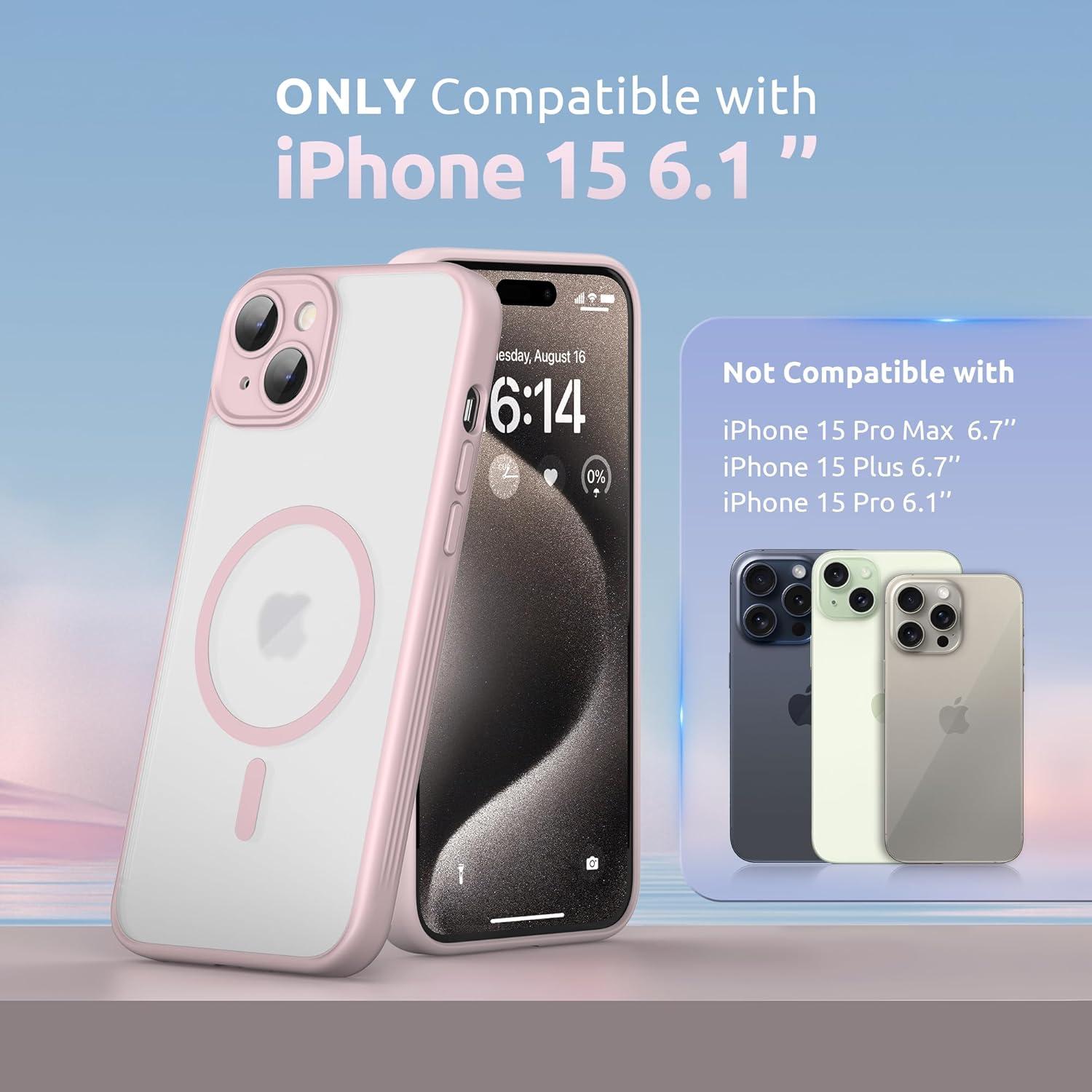SURPHY Made for iPhone 15 Case Compatible with MagSafe, and Screen Protector 2 Pack, Translucent Matte Phone Case with Camera Protective 6.1 inch 2023, Black(Pink)