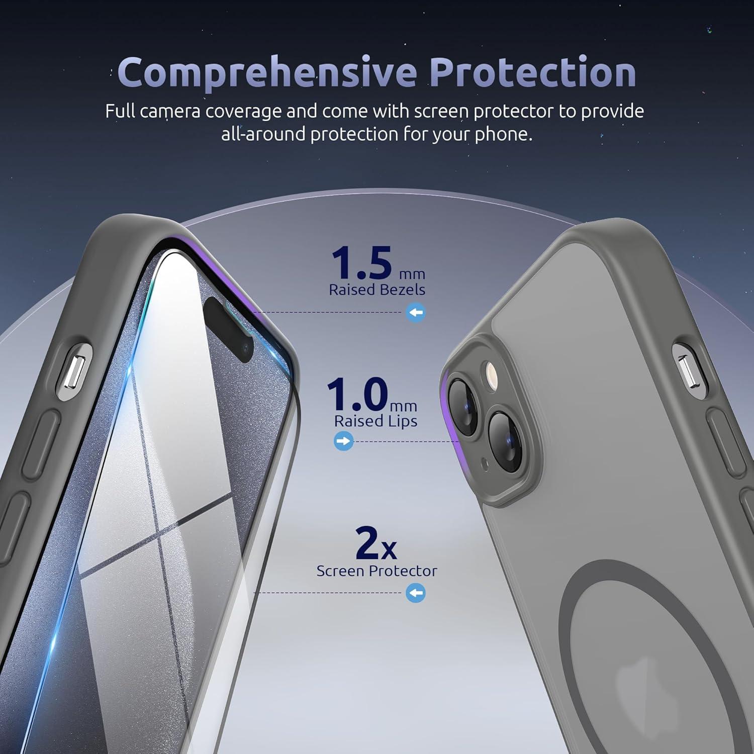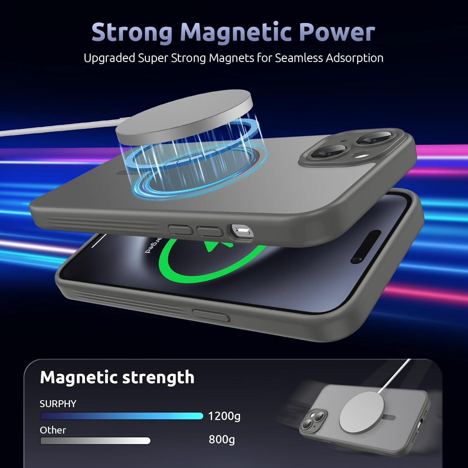 SURPHY Made for iPhone 15 Case Compatible with MagSafe, and Screen Protector 2 Pack, Translucent Matte Phone Case with Camera Protective 6.1 inch 2023, Black(Gray)