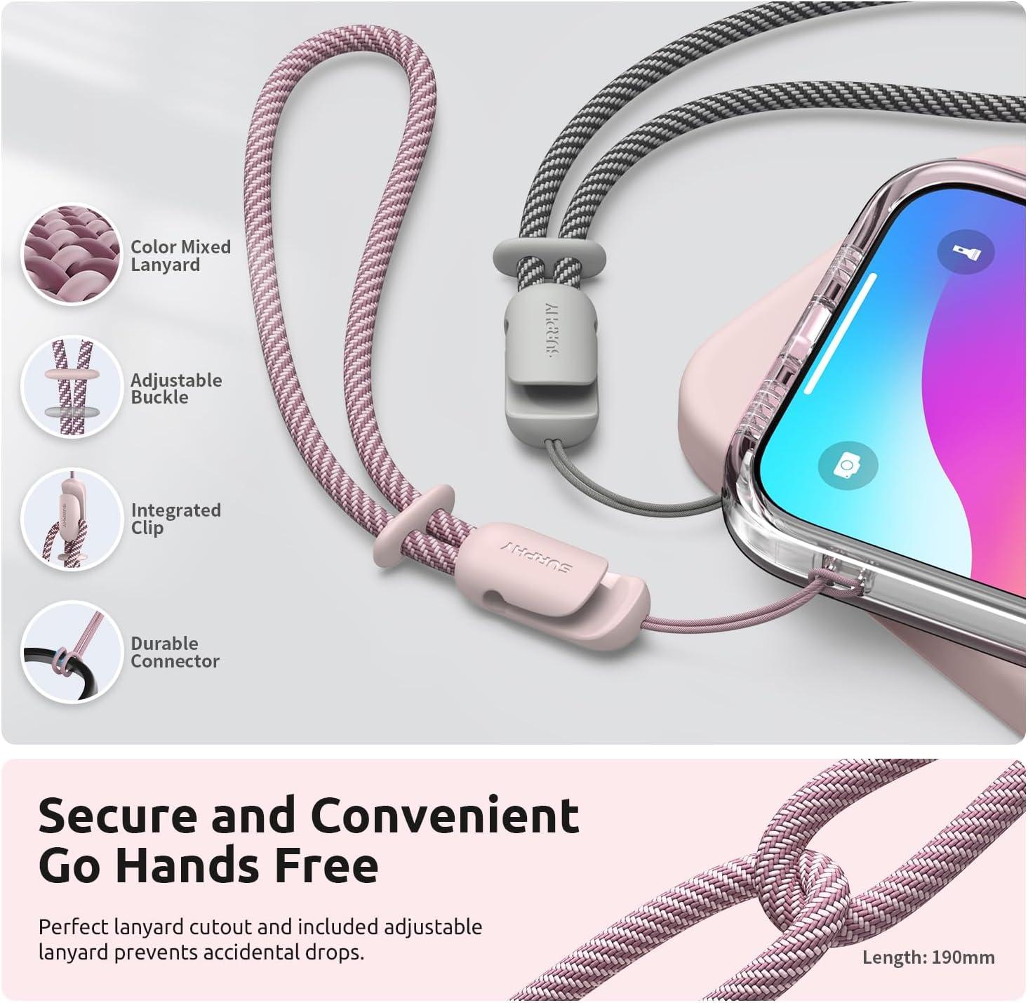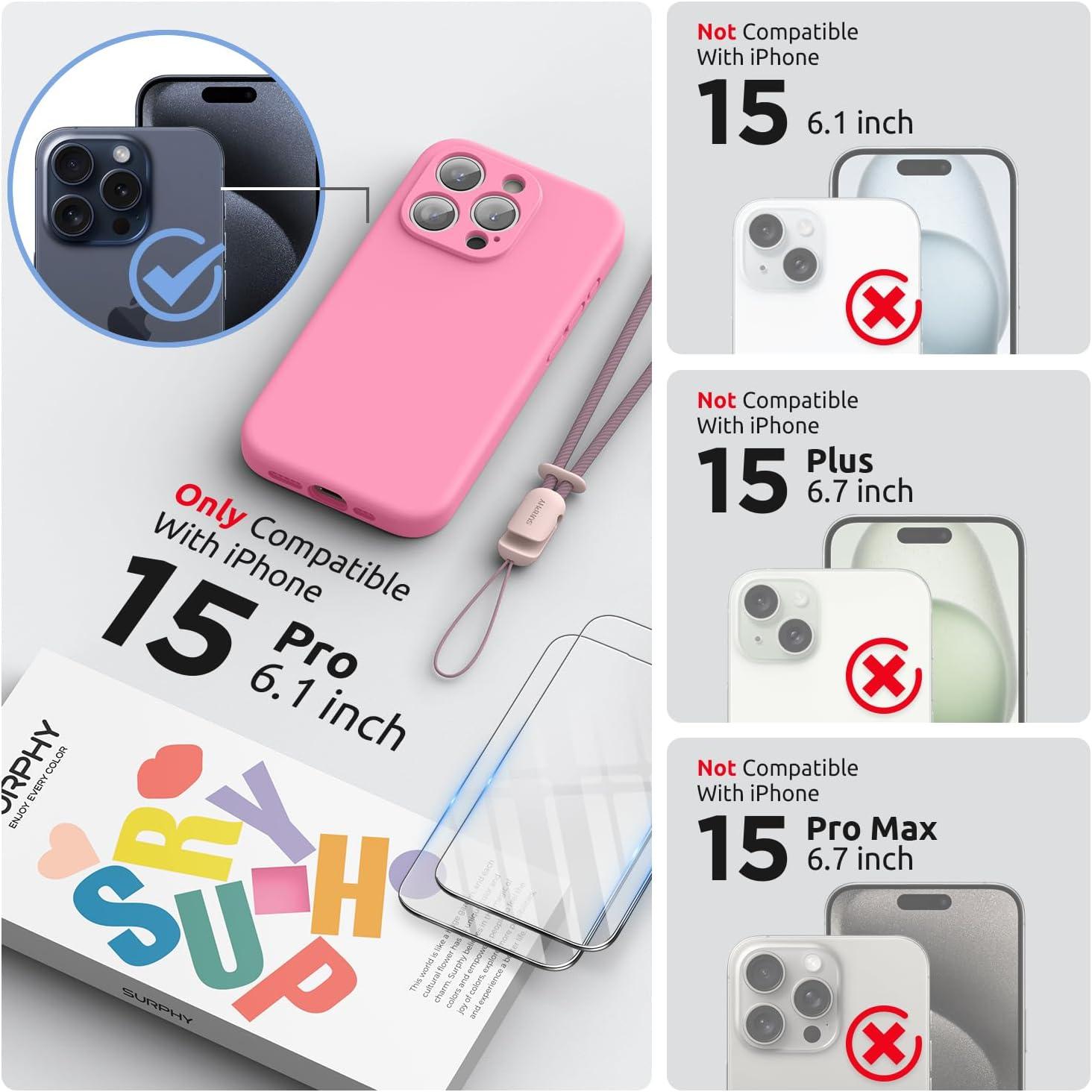 SURPHY Designed for iPhone 15 Pro Case with Screen Protector and Lanyard, Phone Strap and Liquid Silicone Phone Case (Camera Protective & Soft Microfiber Lining) 6.1 inch 2023, Lilac Purple(Pink)