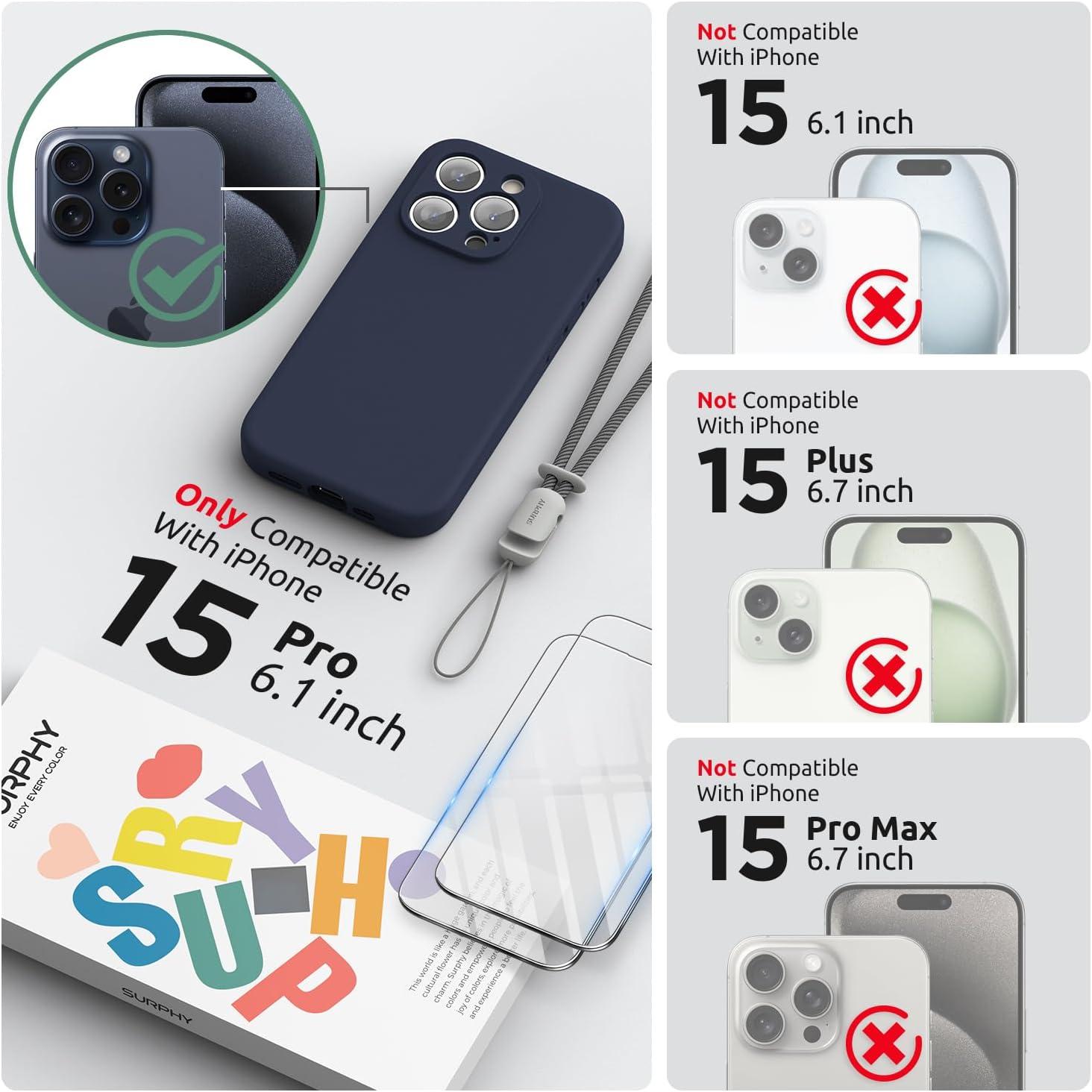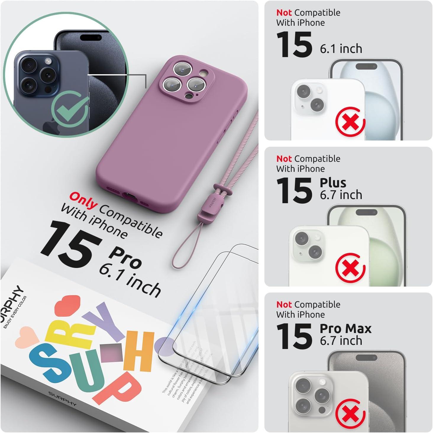 SURPHY Designed for iPhone 15 Pro Case with Screen Protector and Lanyard, Phone Strap and Liquid Silicone Phone Case (Camera Protective & Soft Microfiber Lining) 6.1 inch 2023, Lilac Purple(Black)