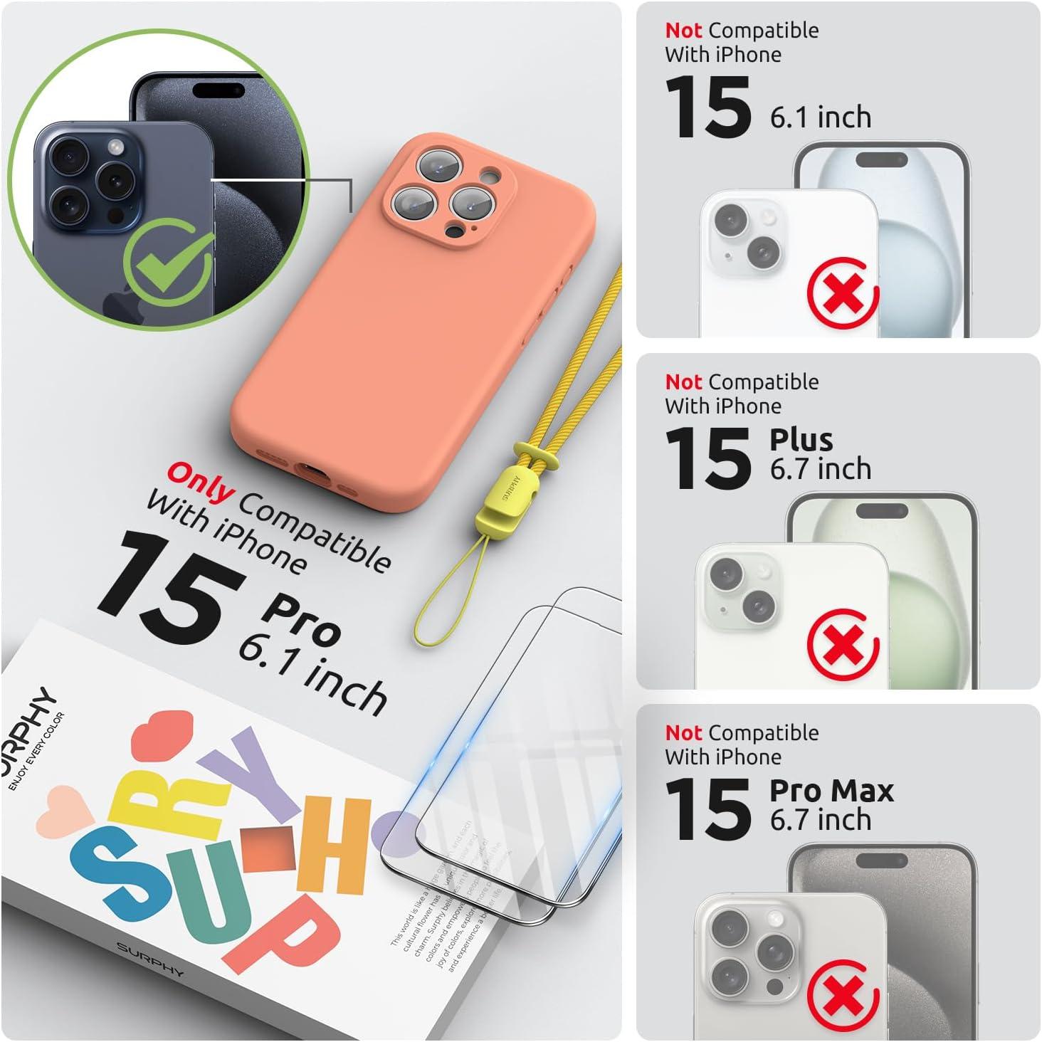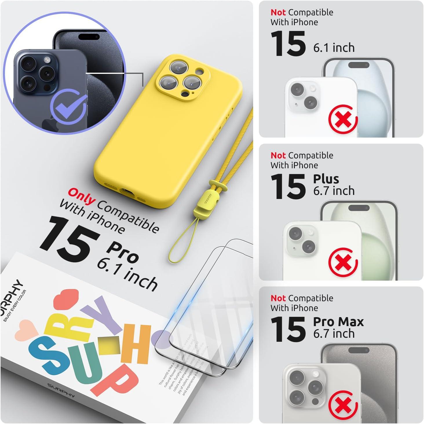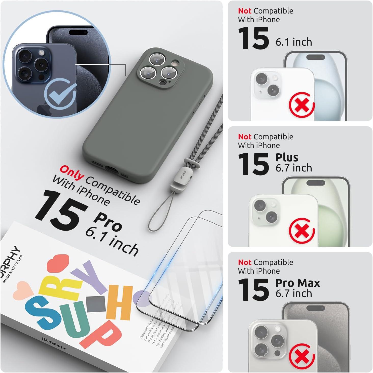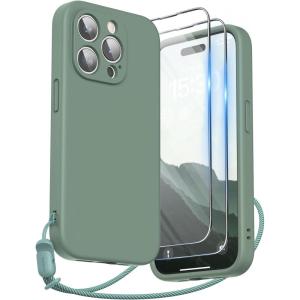 SURPHY Designed for iPhone 15 Pro Case with Screen Protector and Lanyard, Phone Strap and Liquid Silicone Phone Case (Camera Protective & Soft Microfiber Lining) 6.1 inch 2023, Lilac Purple(Cactus Green)