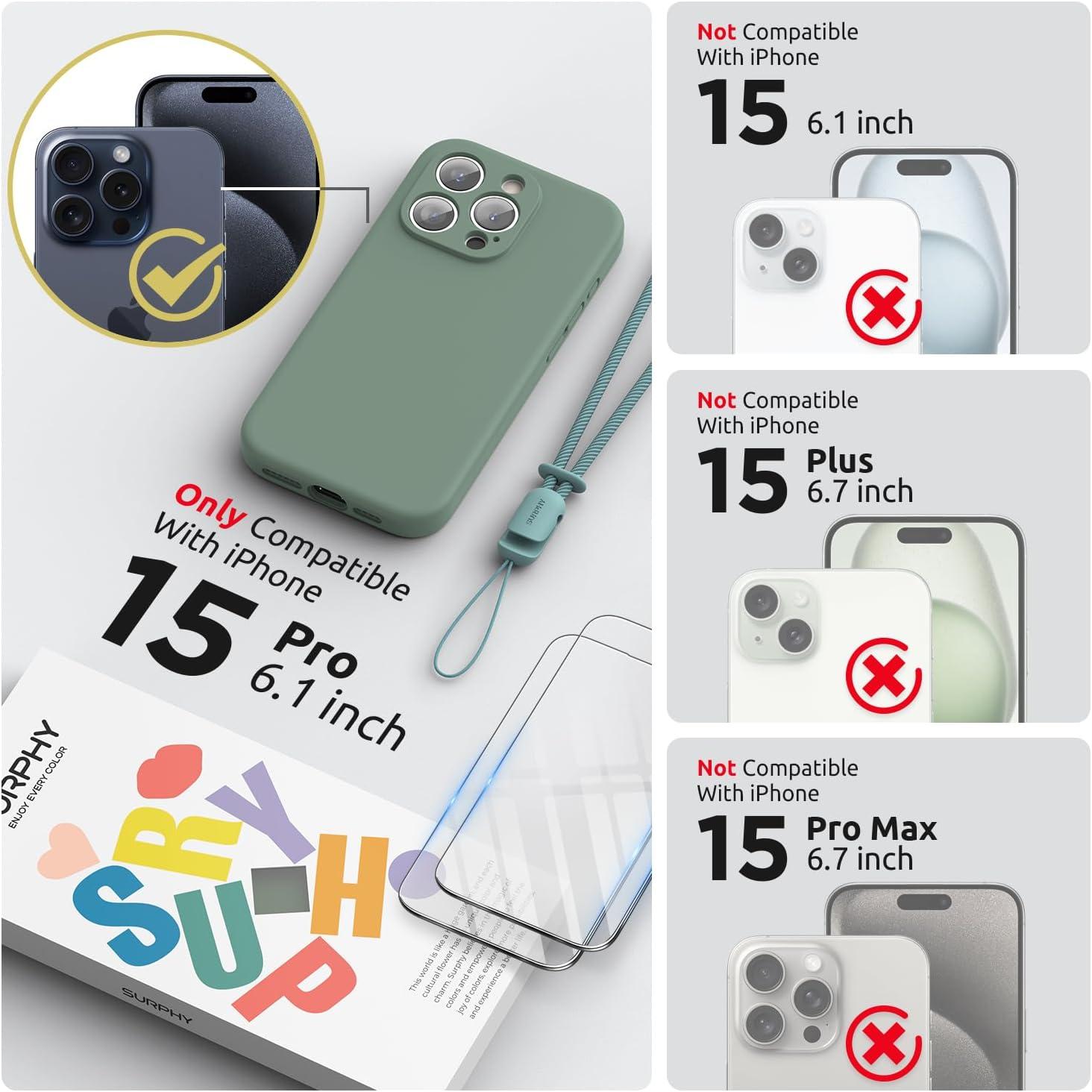 SURPHY Designed for iPhone 15 Pro Case Compatible with MagSafe (6.1 inch 2023), with 2 Pack Screen Protector, Liquid Silicone Phone Case (Camera Protective & Soft Microfiber Lining), Cactus Green(Lilac)