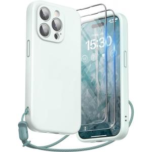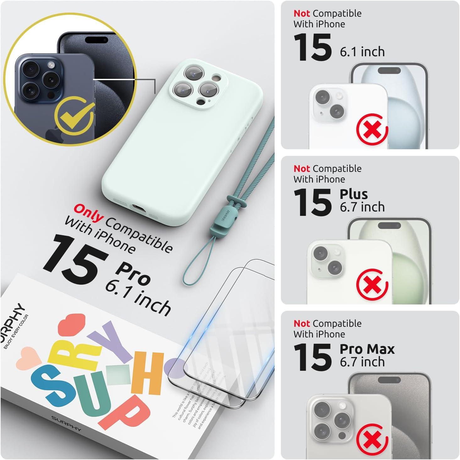 SURPHY Designed for iPhone 15 Pro Case with Screen Protector and Lanyard, Phone Strap and Liquid Silicone Phone Case (Camera Protective & Soft Microfiber Lining) 6.1 inch 2023, Lilac Purple(Soft Mint)