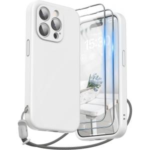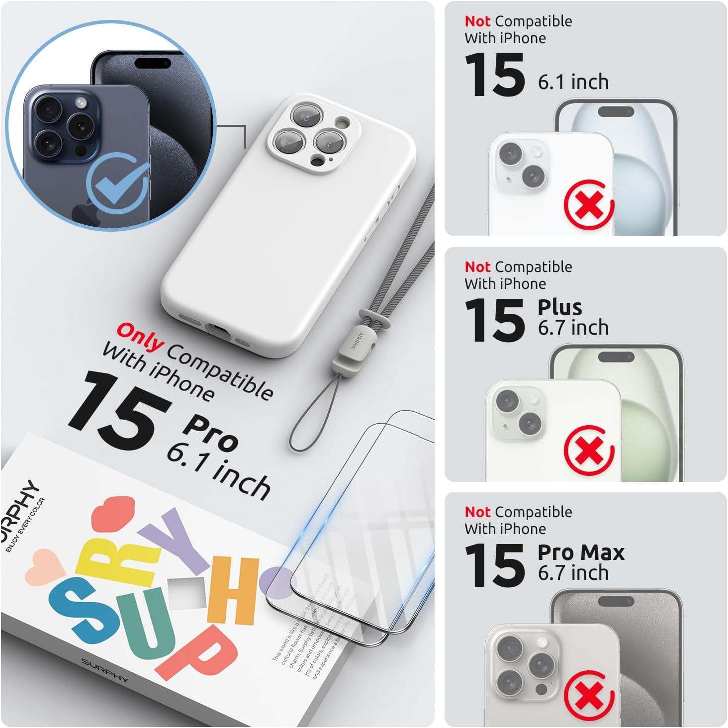 SURPHY Designed for iPhone 15 Pro Case with Screen Protector and Lanyard, Phone Strap and Liquid Silicone Phone Case (Camera Protective & Soft Microfiber Lining) 6.1 inch 2023, Lilac Purple(White)