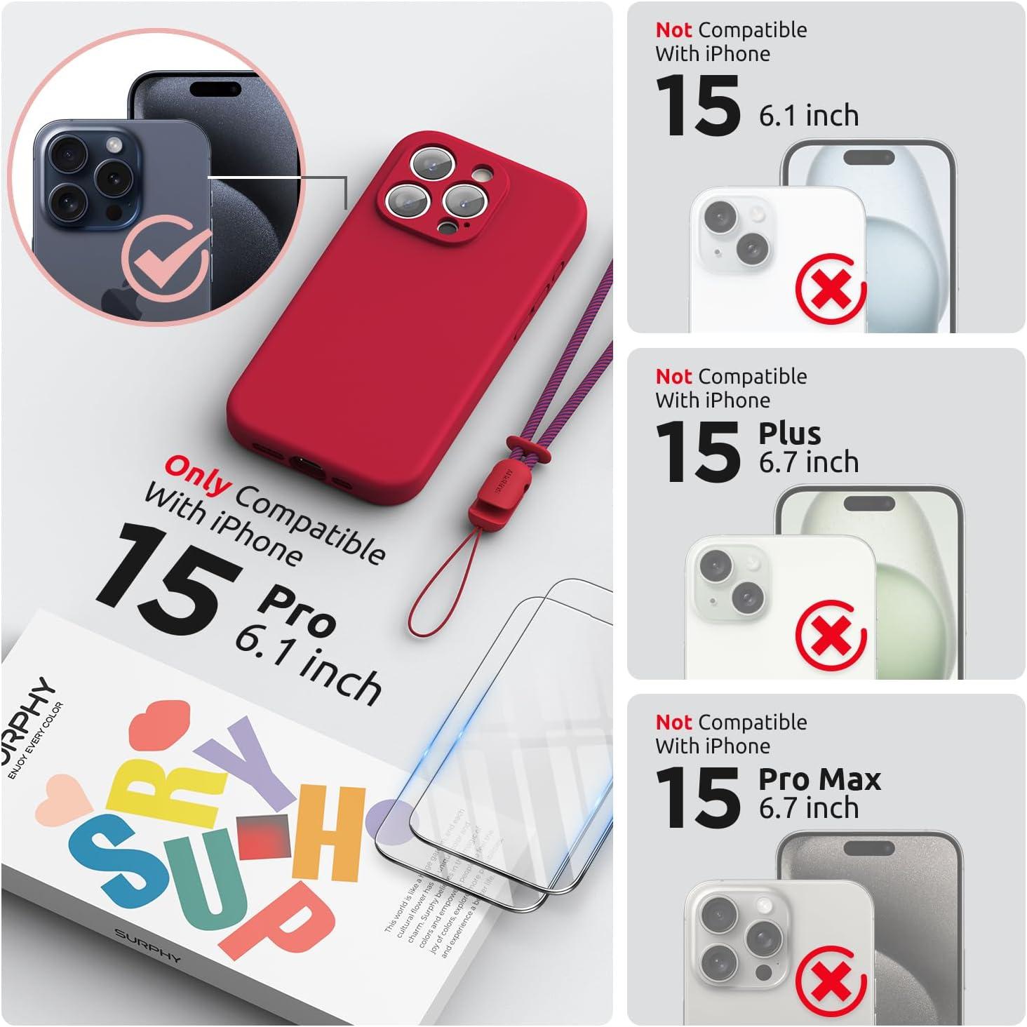 SURPHY Designed for iPhone 15 Pro Case with Screen Protector and Lanyard, Phone Strap and Liquid Silicone Phone Case (Camera Protective & Soft Microfiber Lining) 6.1 inch 2023, Lilac Purple(Red)