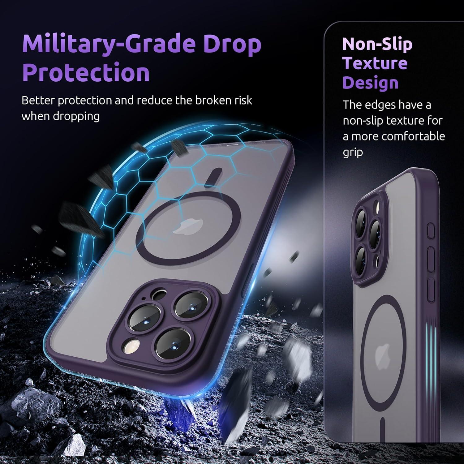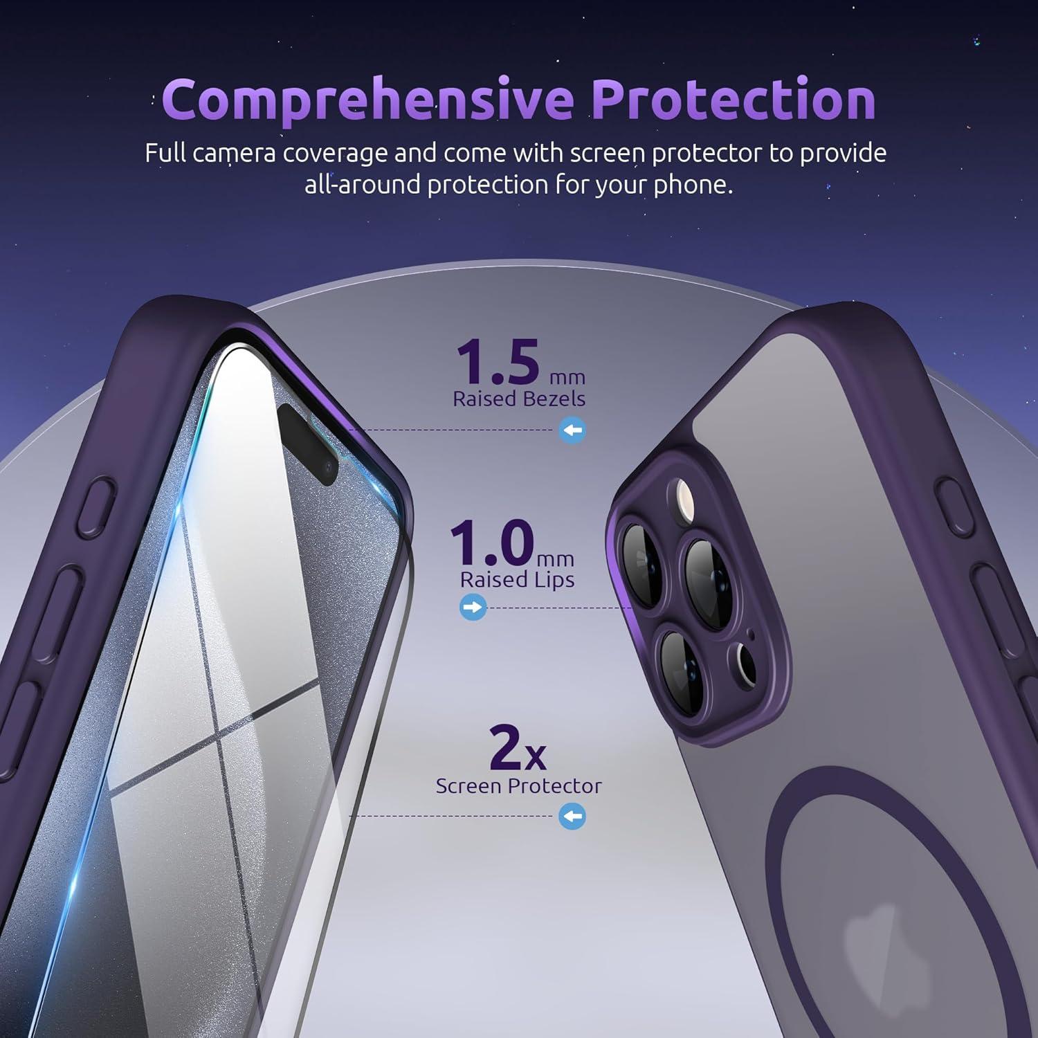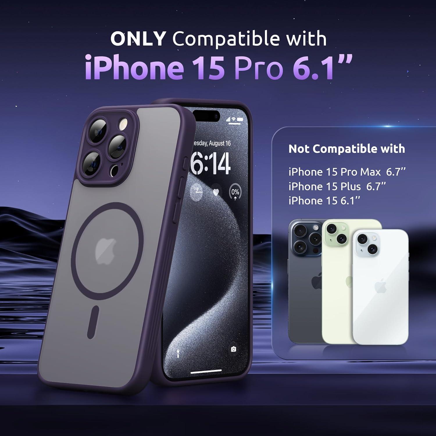 SURPHY Made for iPhone 15 Pro Case Compatible with MagSafe, and Screen Protector 2 Pack, Translucent Matte Phone Case with Camera Protective 6.1 inch 2023, Black(Purple)
