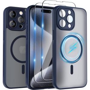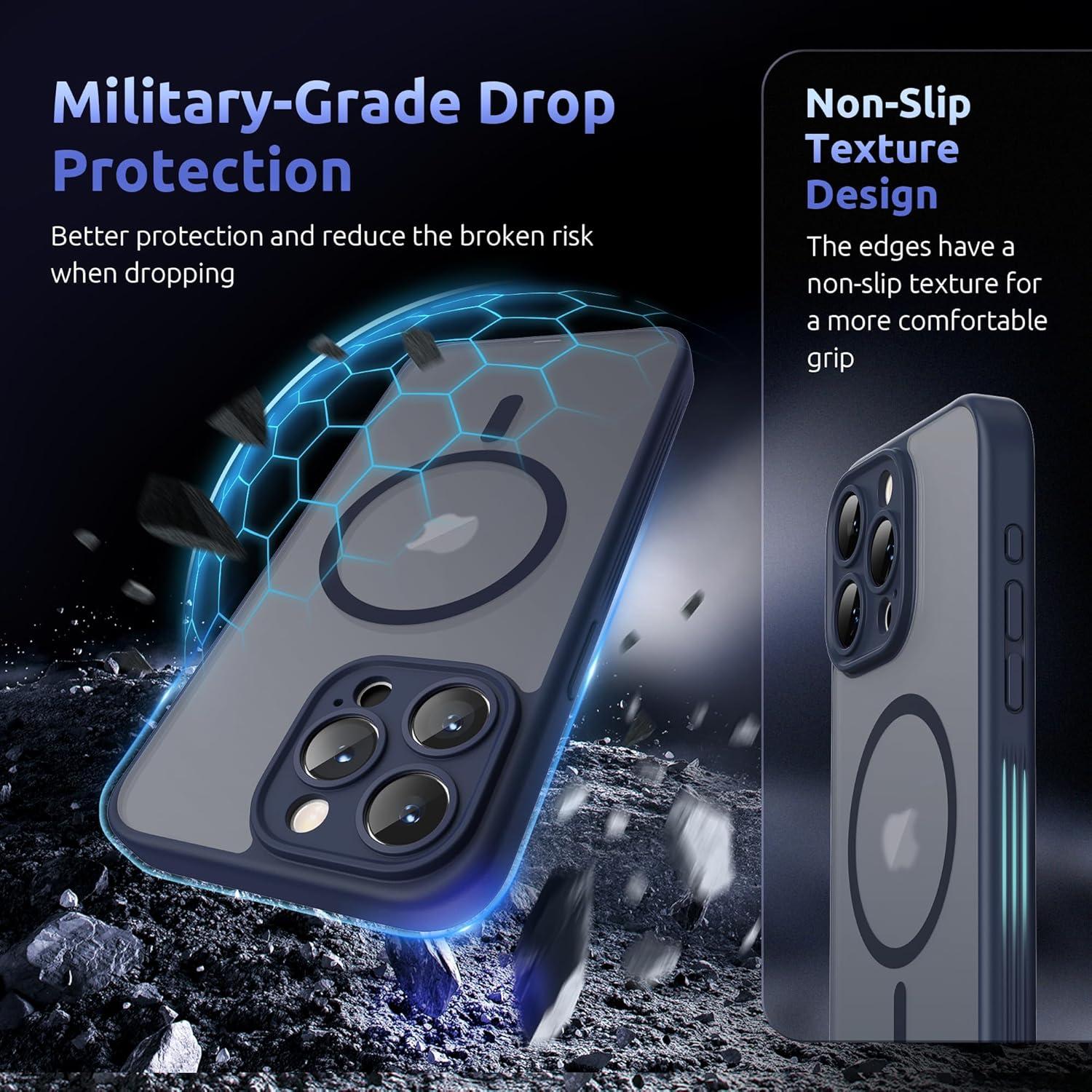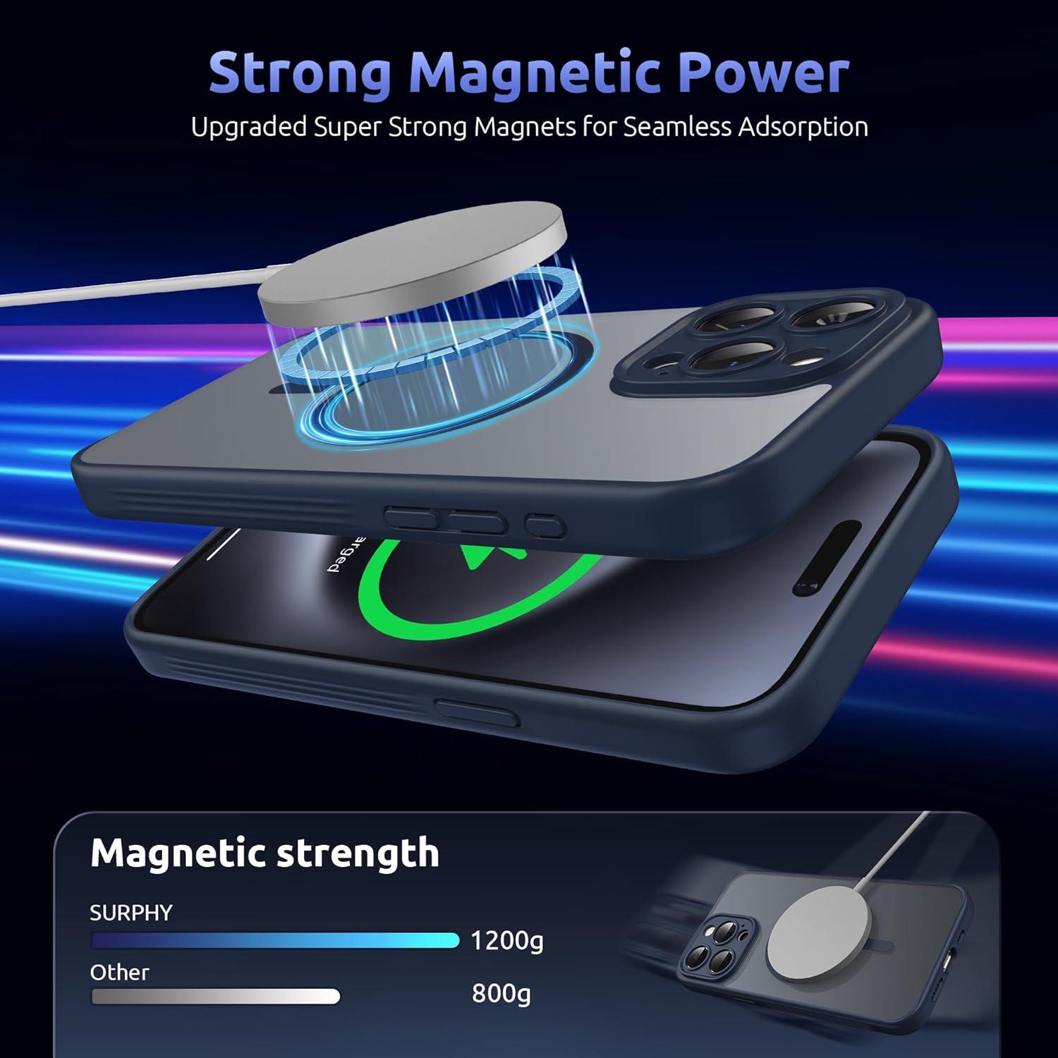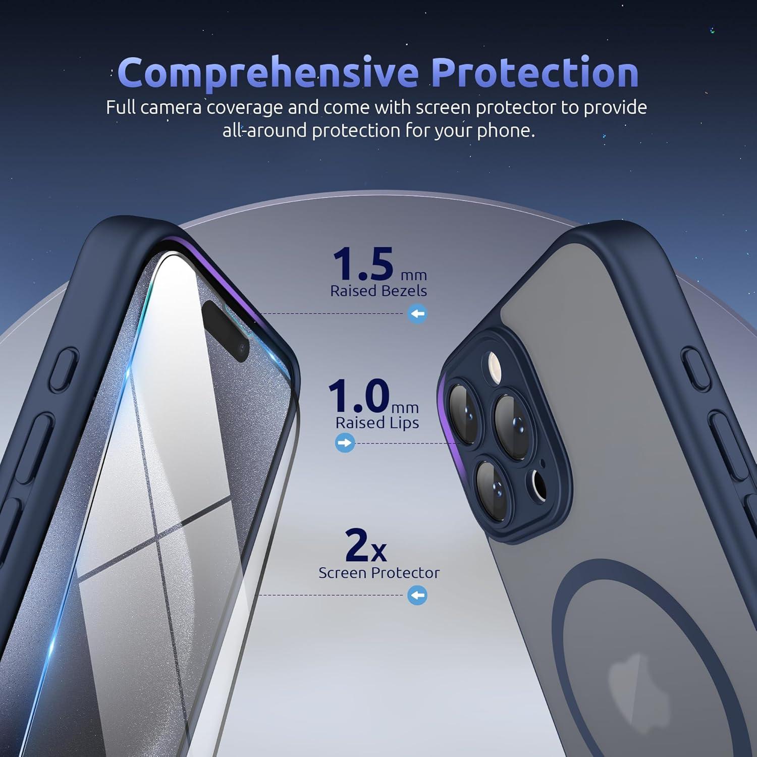 SURPHY Made for iPhone 15 Pro Case Compatible with MagSafe, and Screen Protector 2 Pack, Translucent Matte Phone Case with Camera Protective 6.1 inch 2023, Black(Blue)