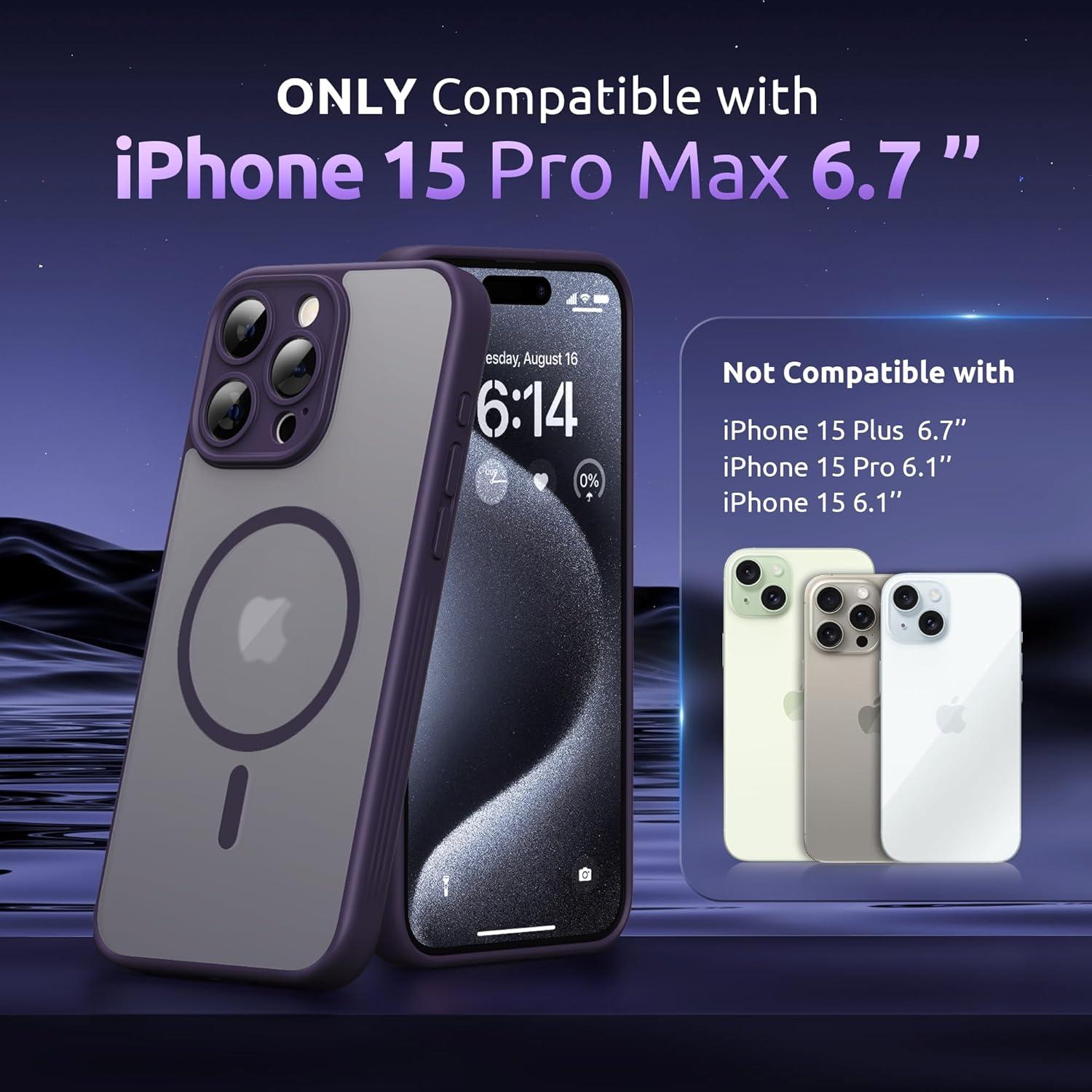 SURPHY Made for iPhone 15 Pro Max Case Compatible with MagSafe, and Screen Protector 2 Pack, Translucent Matte Phone Case with Camera Protective 6.7 inch 2023, Black(Purple)