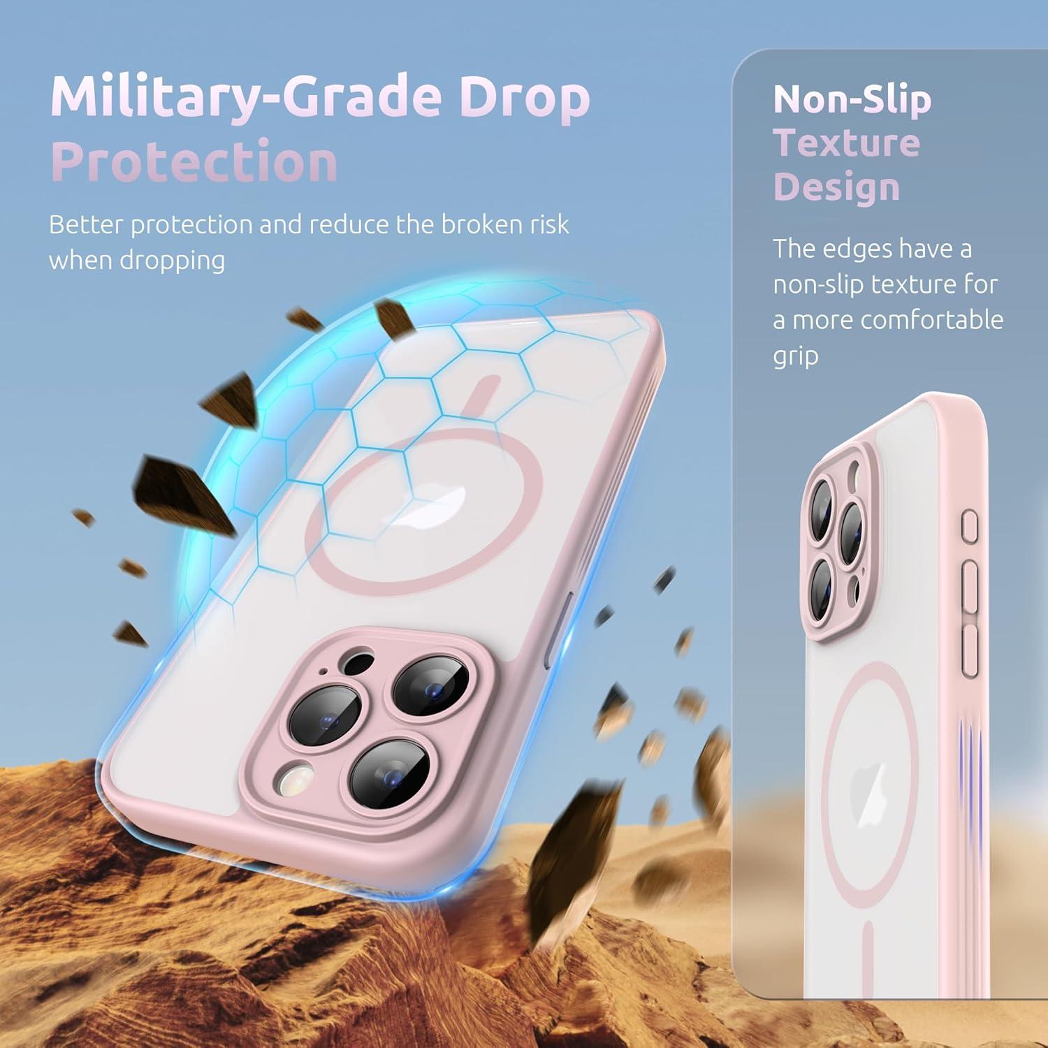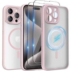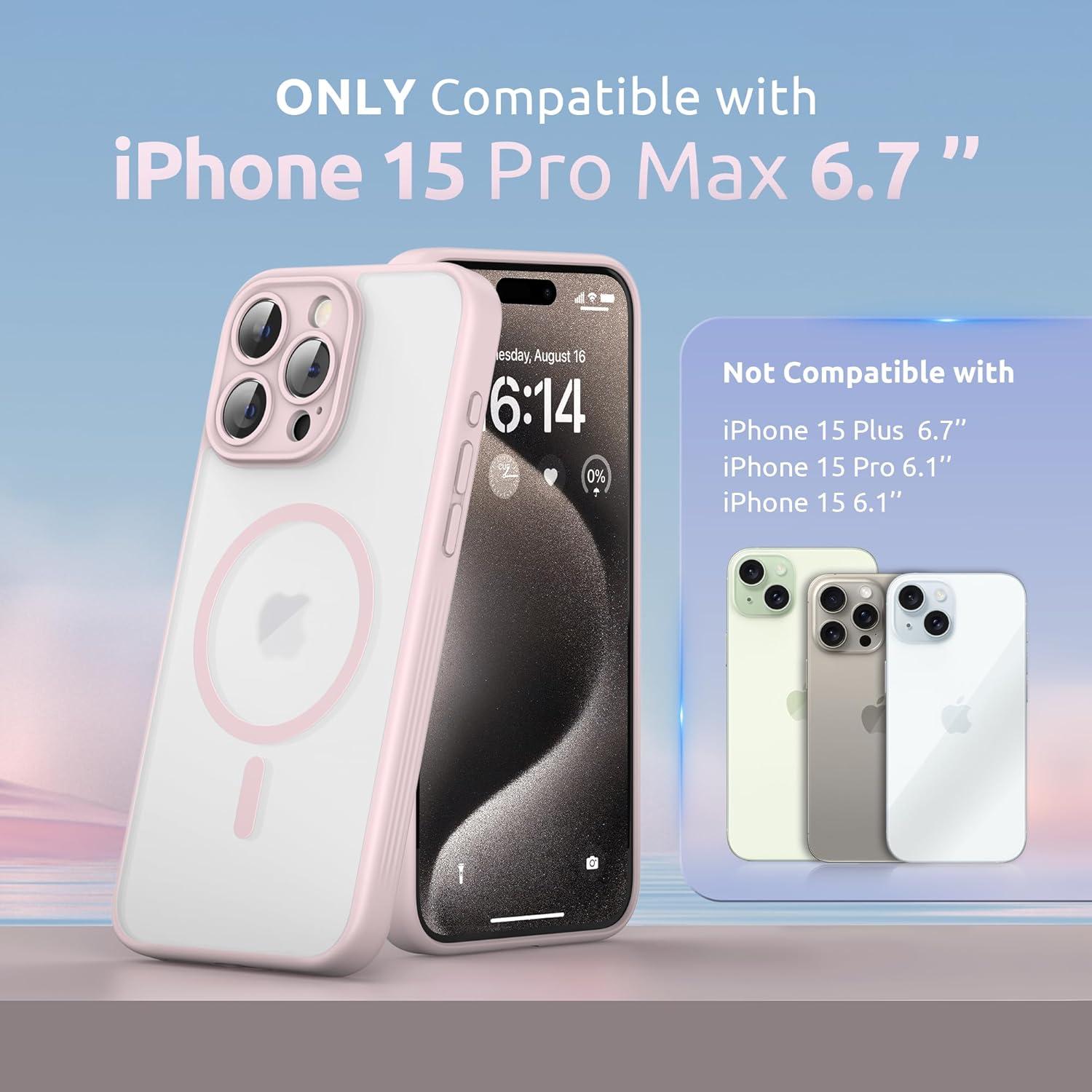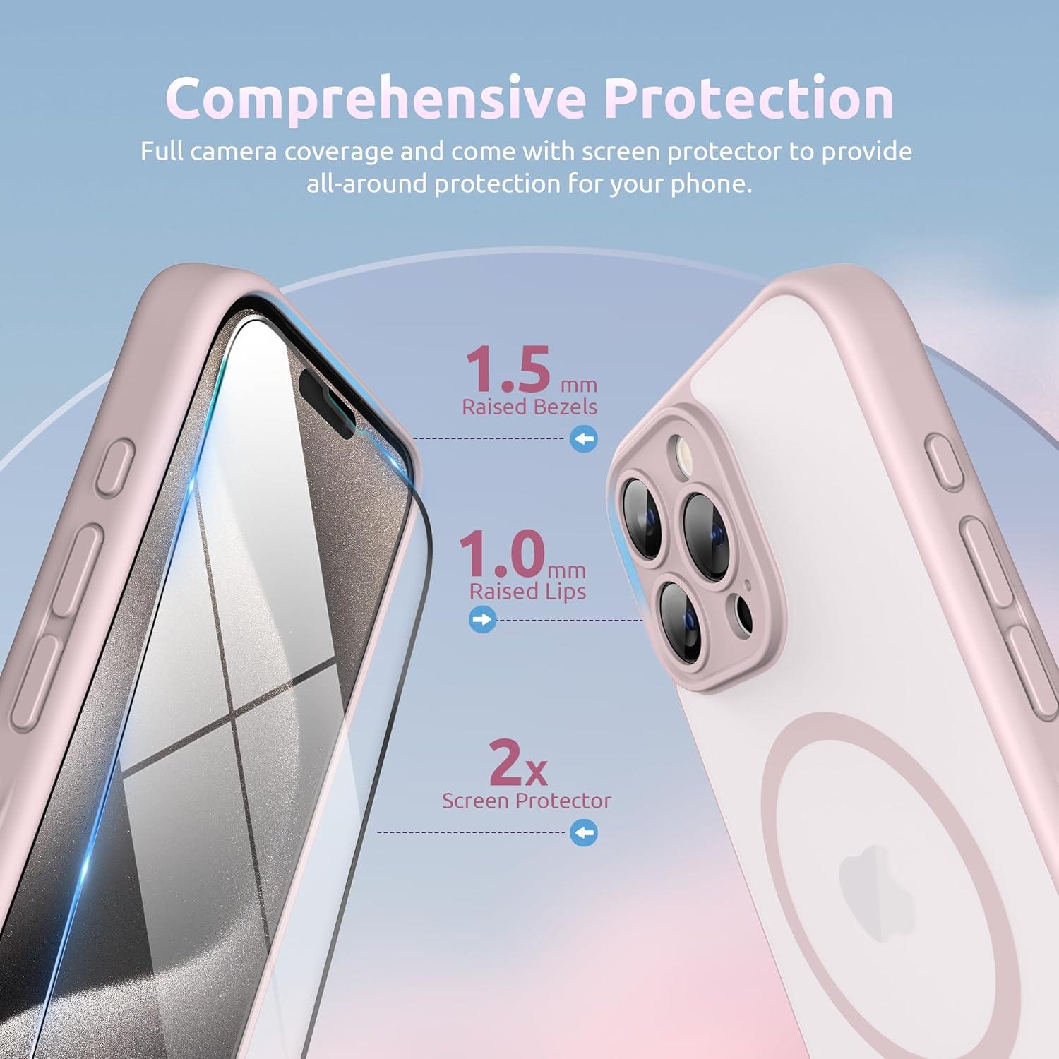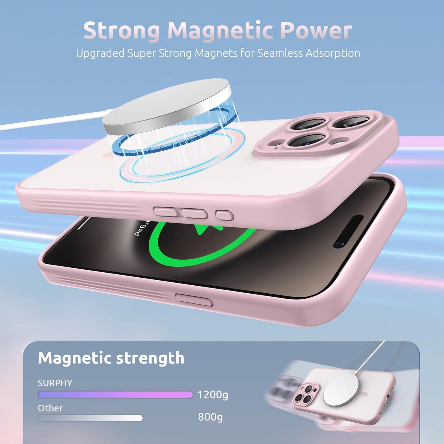 SURPHY Made for iPhone 15 Pro Max Case Compatible with MagSafe, and Screen Protector 2 Pack, Translucent Matte Phone Case with Camera Protective 6.7 inch 2023, Black(Pink)