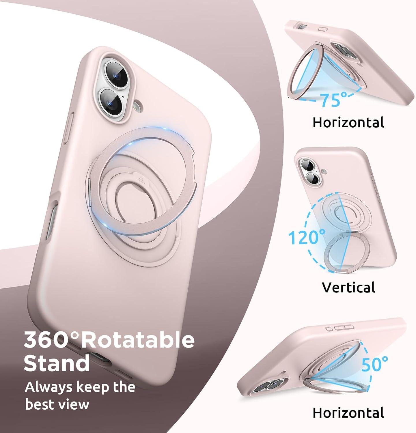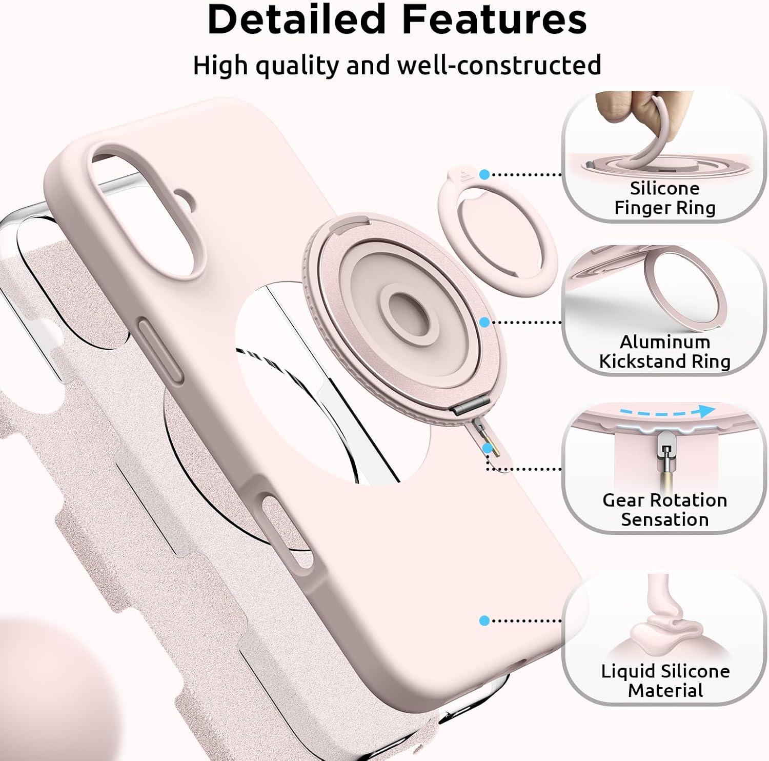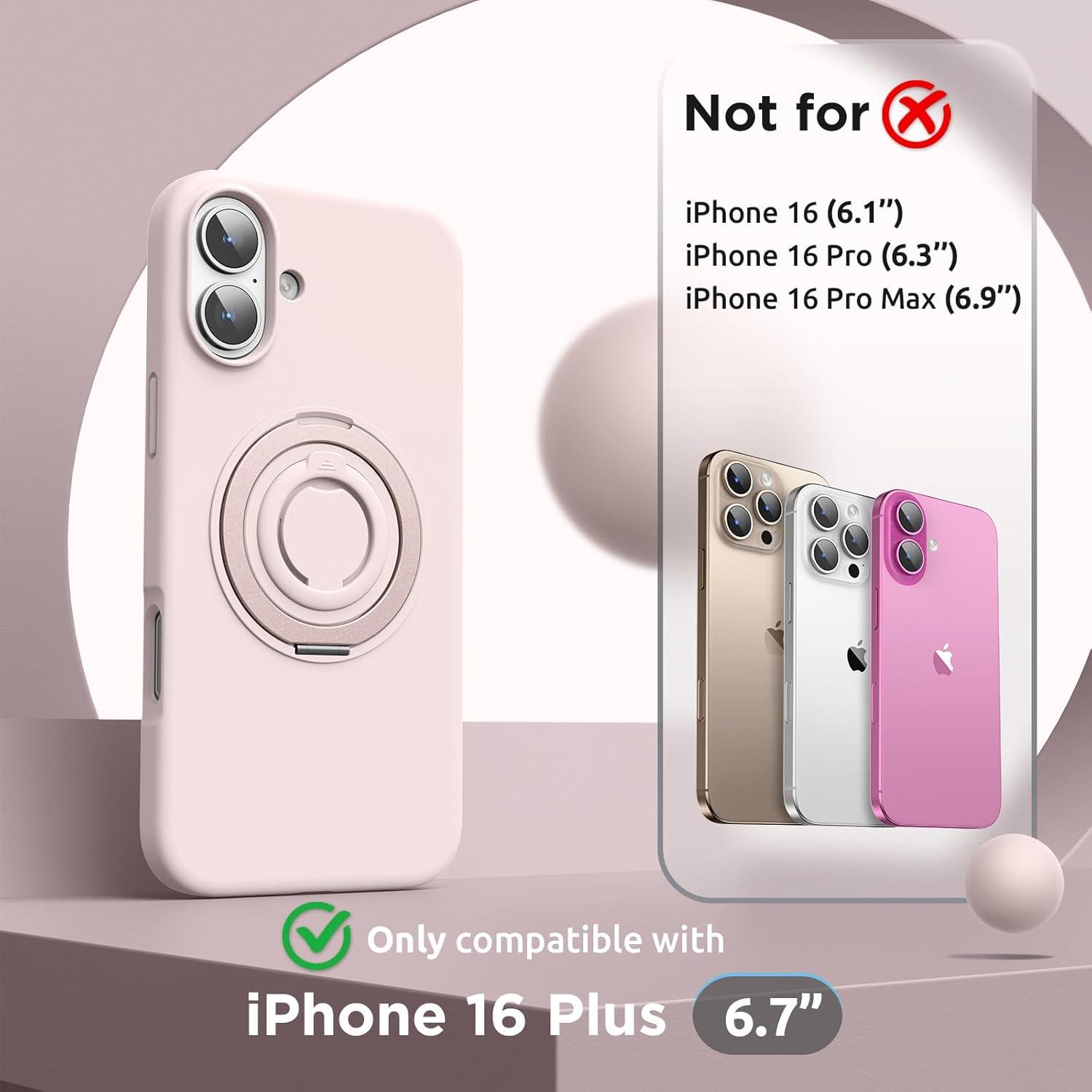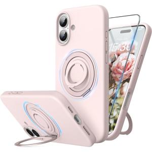 SURPHY 360° Magnetic Stand for iPhone 16 Plus Case with Finger Ring, Compatible with MagSafe, with Screen Protector, Ring Stand and Finger Phone Case for 16 Plus 6.7 inch 2024, Frosted Black(Light Pink)
