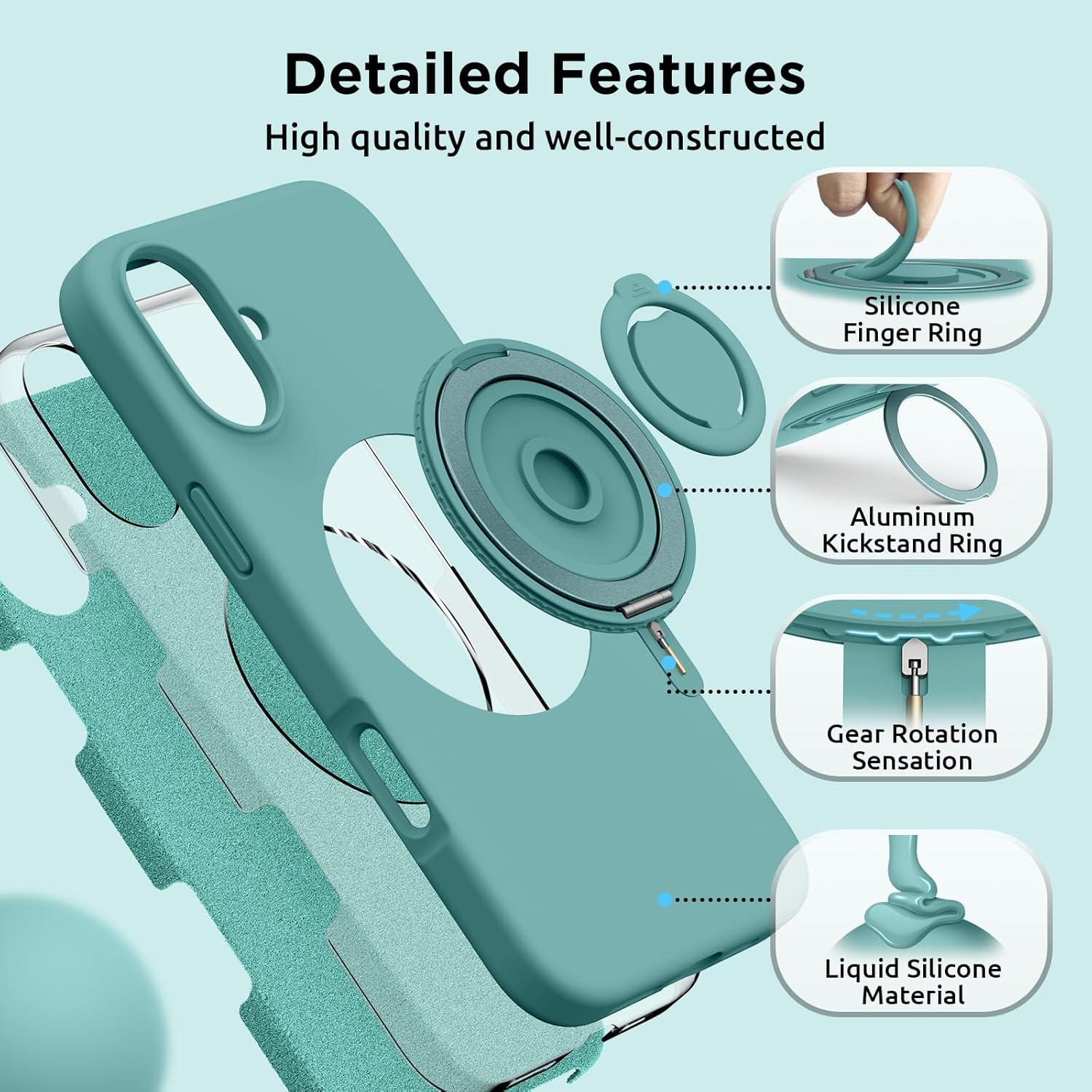 SURPHY 360° Magnetic Stand for iPhone 16 Plus Case with Finger Ring, Compatible with MagSafe, with Screen Protector, Ring Stand and Finger Phone Case for 16 Plus 6.7 inch 2024, Frosted Black(Green)
