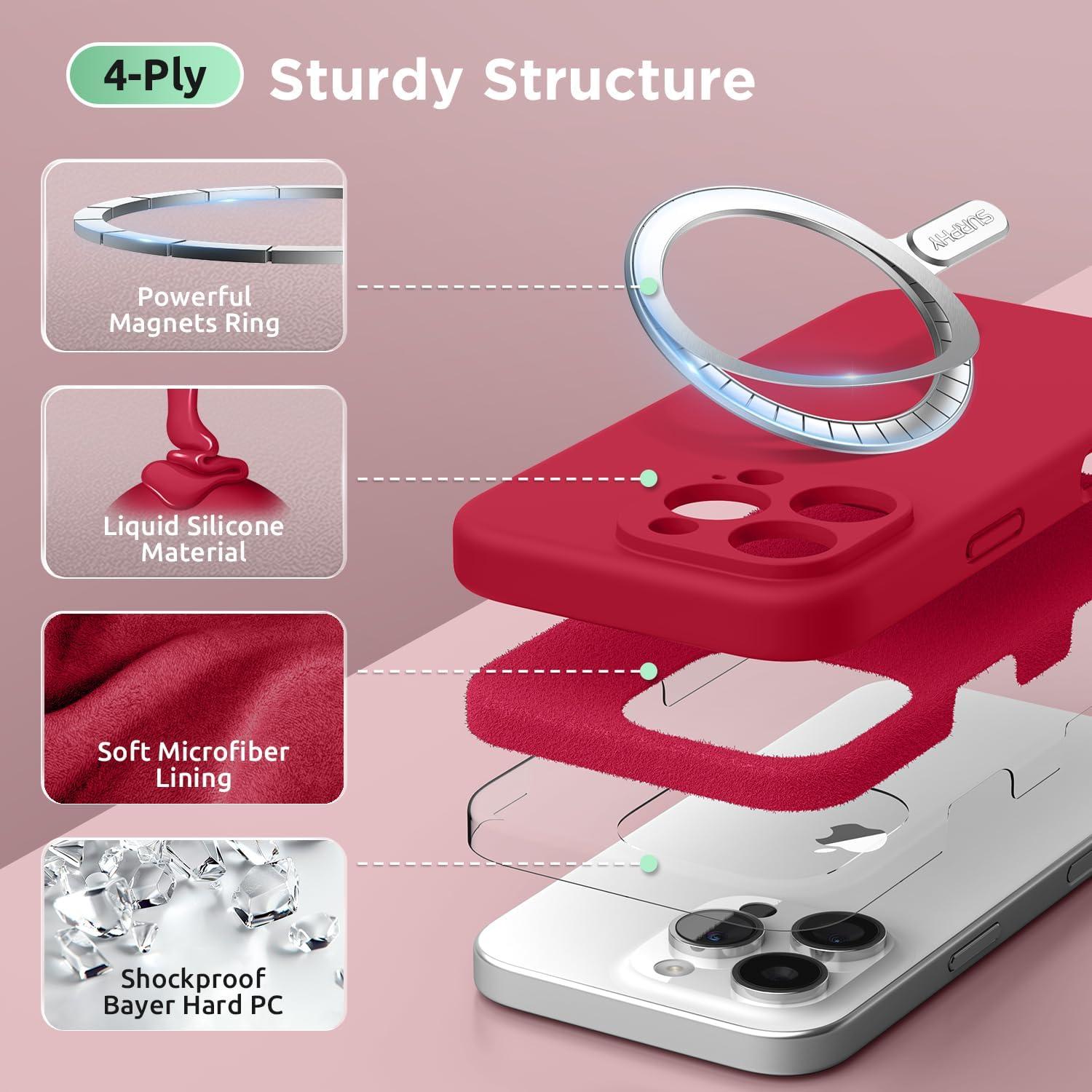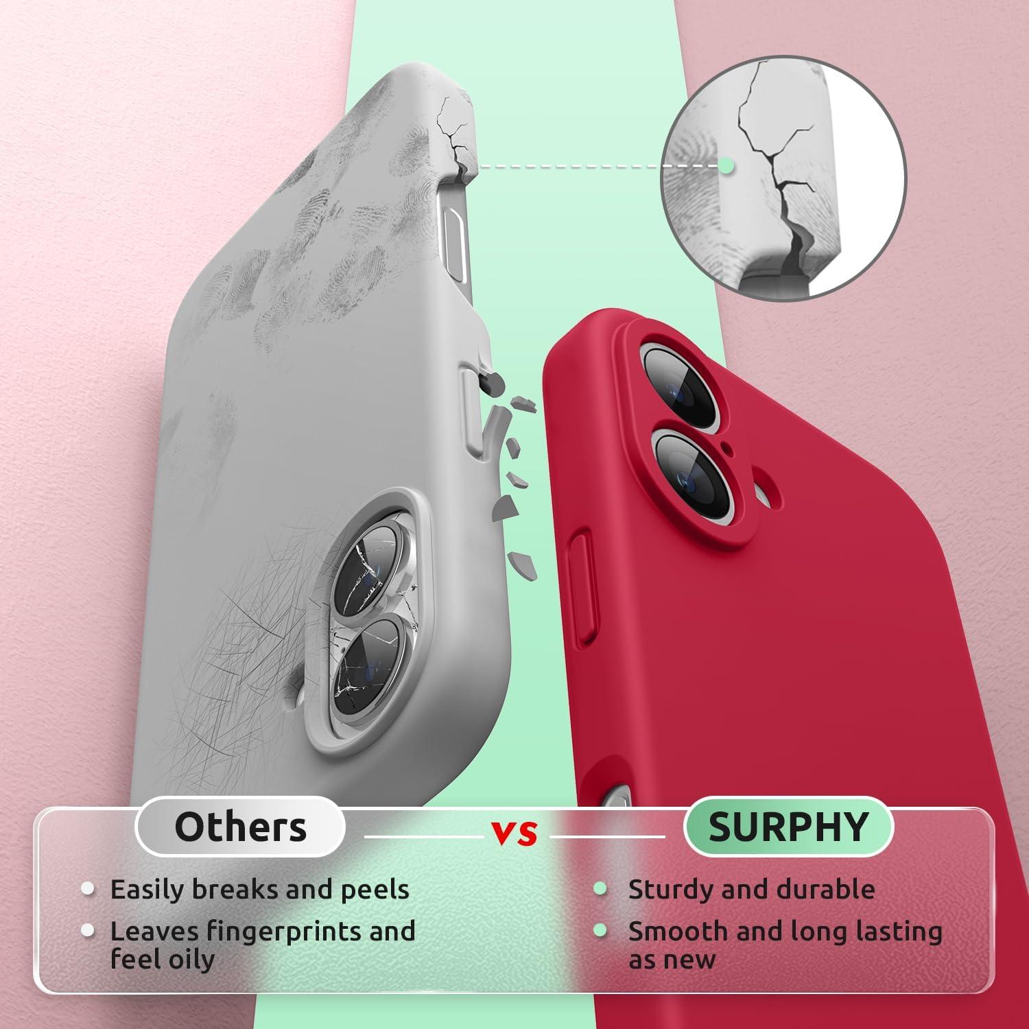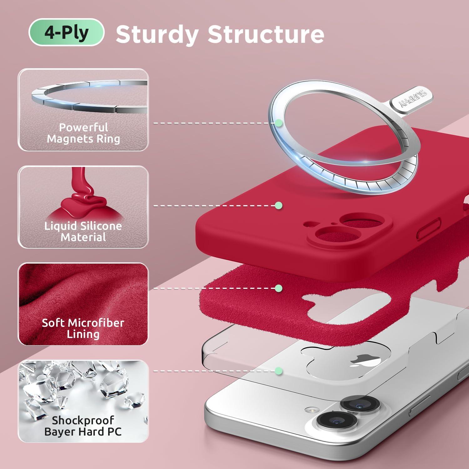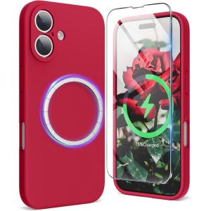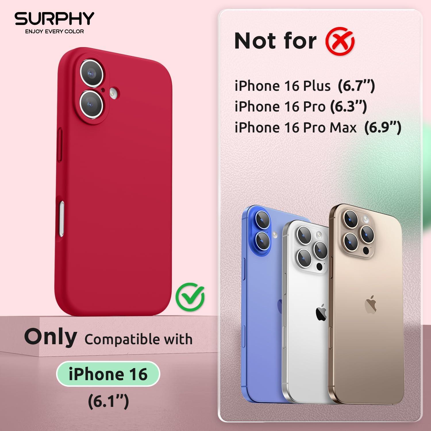 SURPHY Designed for iPhone 16 Case Compatible with MagSafe (6.1 inch 2024), with Screen Protector Liquid Silicone Phone Case (Camera Protective, Soft Microfiber Lining), Black(Red)