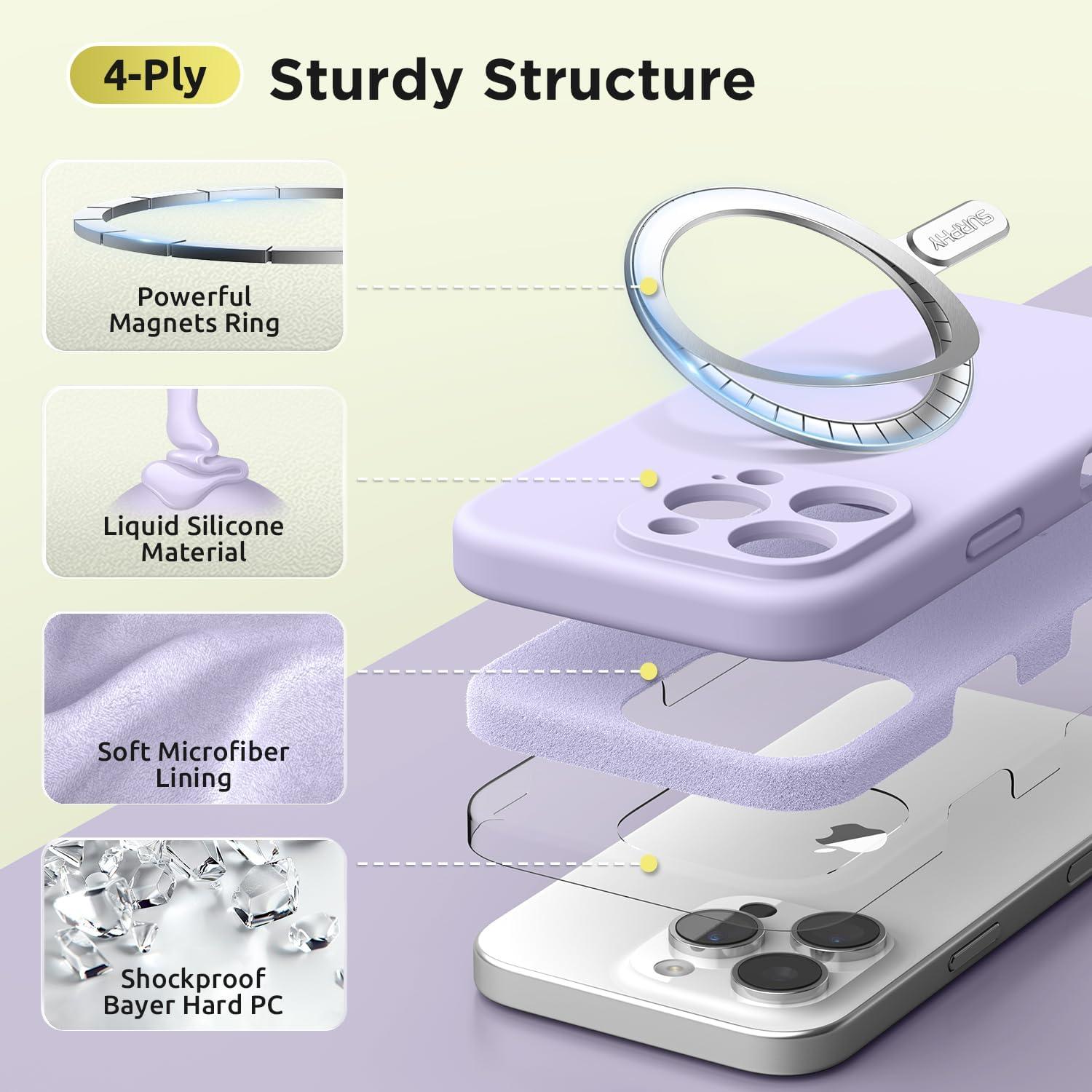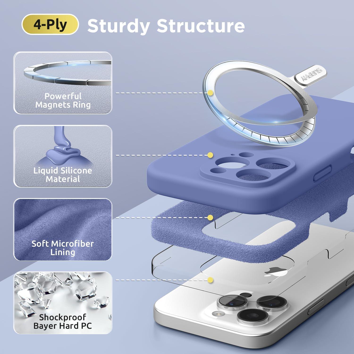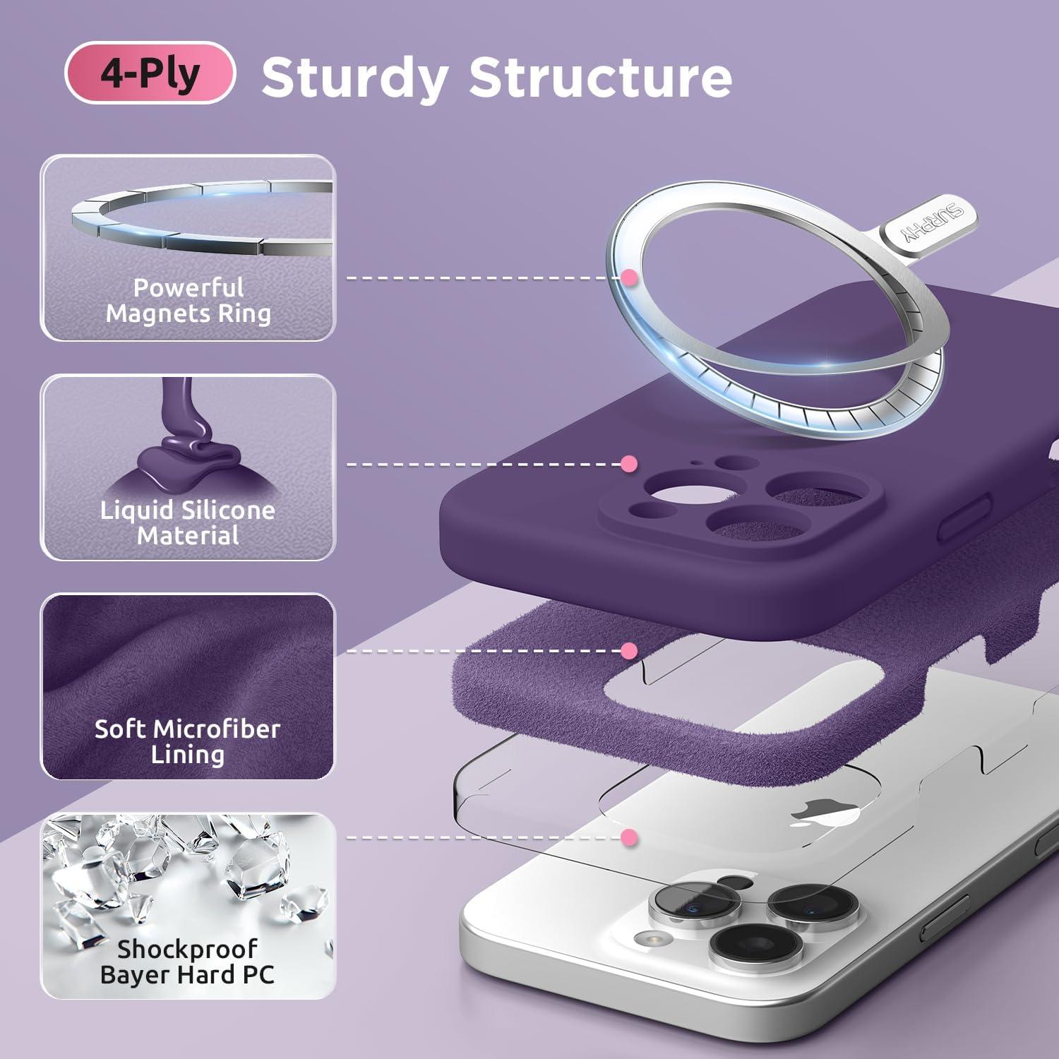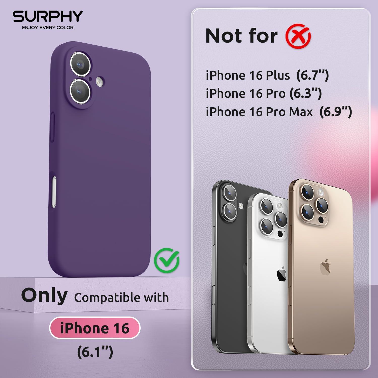 SURPHY Designed for iPhone 16 Case Compatible with MagSafe (6.1 inch 2024), with Screen Protector Liquid Silicone Phone Case (Camera Protective, Soft Microfiber Lining), Black(Lilac Purple)