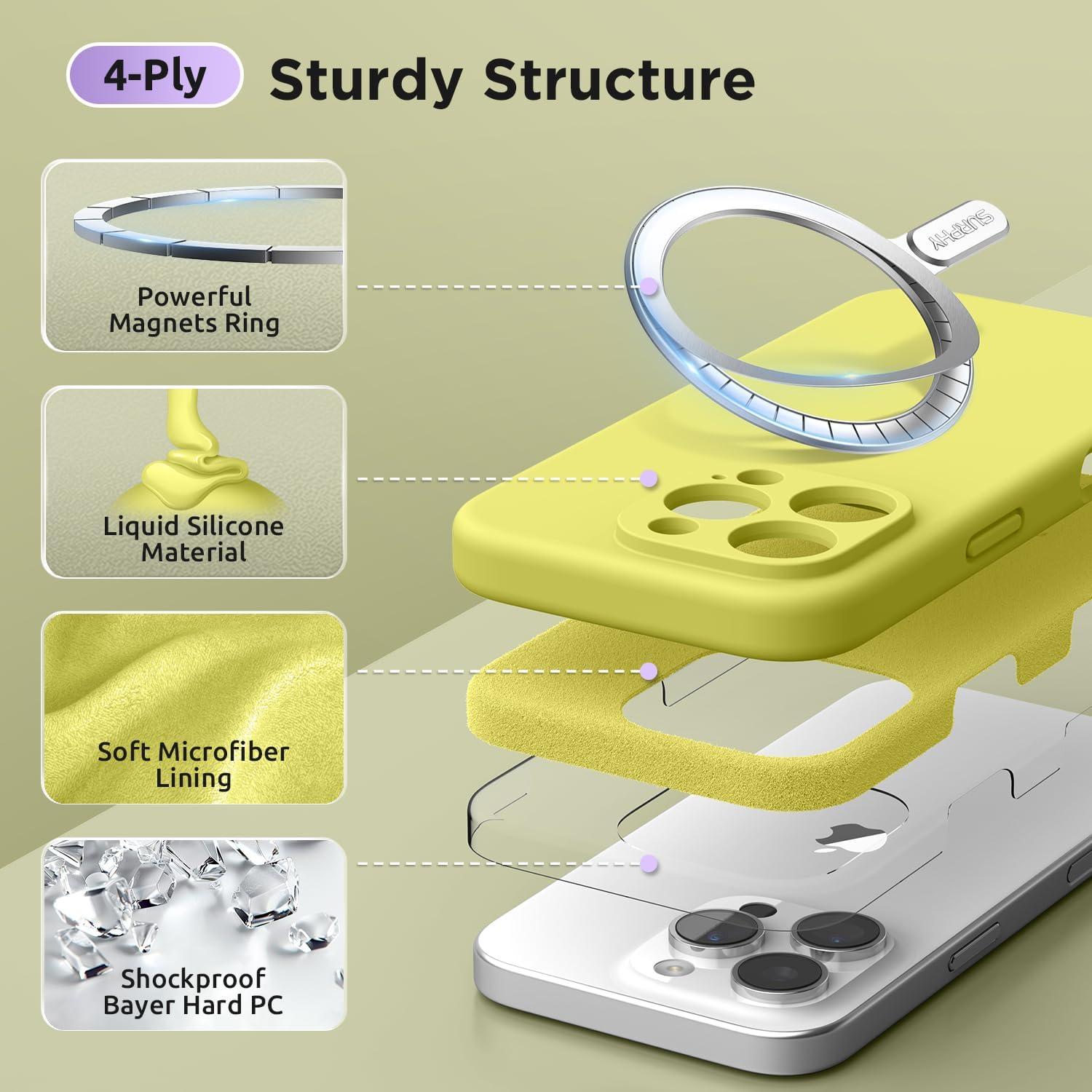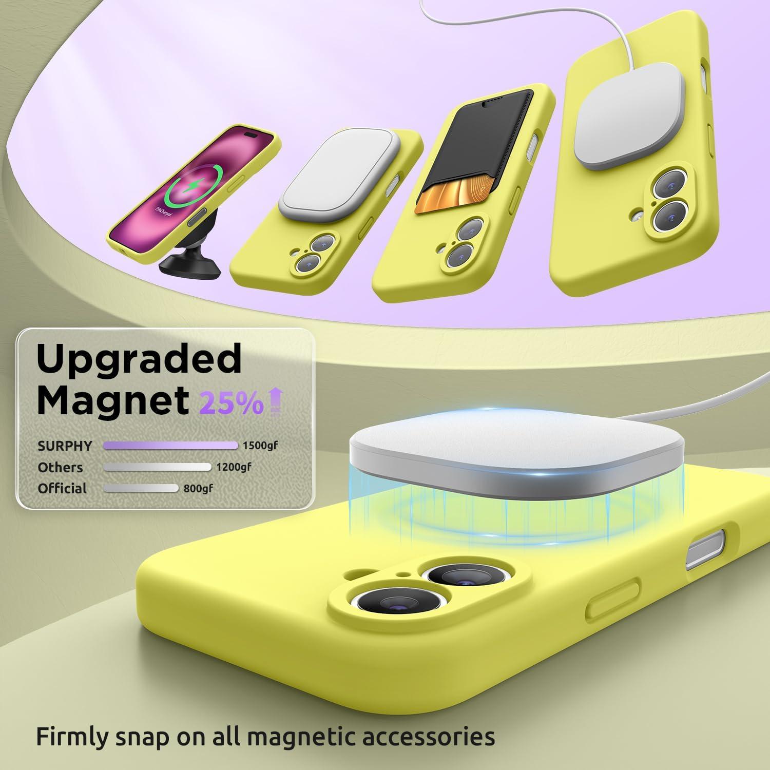 SURPHY Designed for iPhone 16 Case Compatible with MagSafe (6.1 inch 2024), with Screen Protector Liquid Silicone Phone Case (Camera Protective, Soft Microfiber Lining), Black(Yellow)