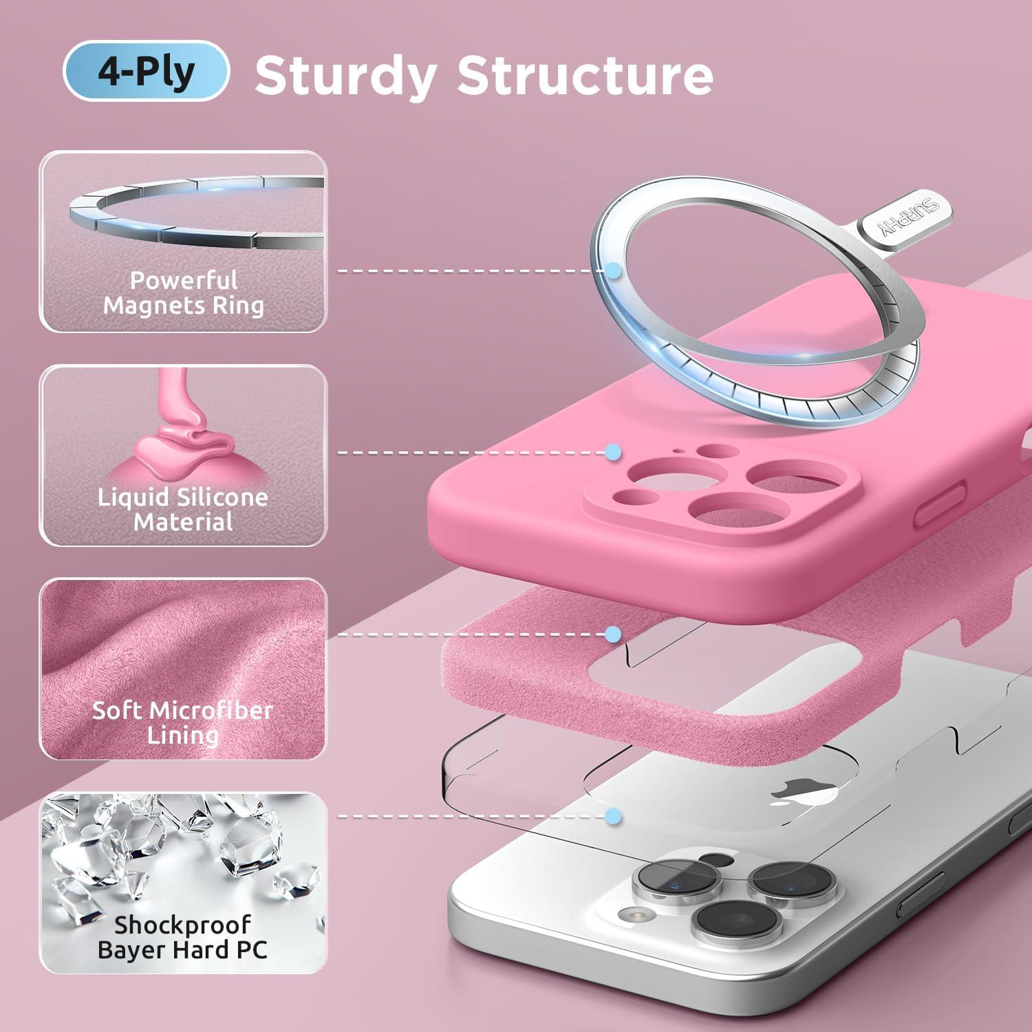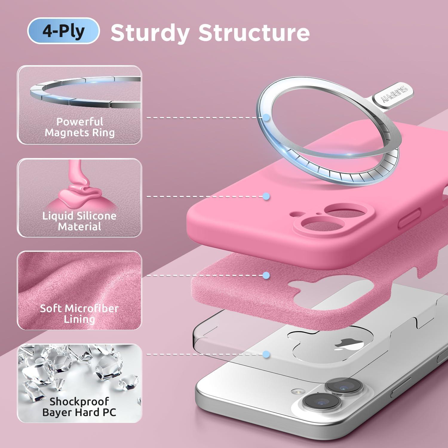 SURPHY Designed for iPhone 16 Case Compatible with MagSafe (6.1 inch 2024), with Screen Protector Liquid Silicone Phone Case (Camera Protective, Soft Microfiber Lining), Black(Pink)
