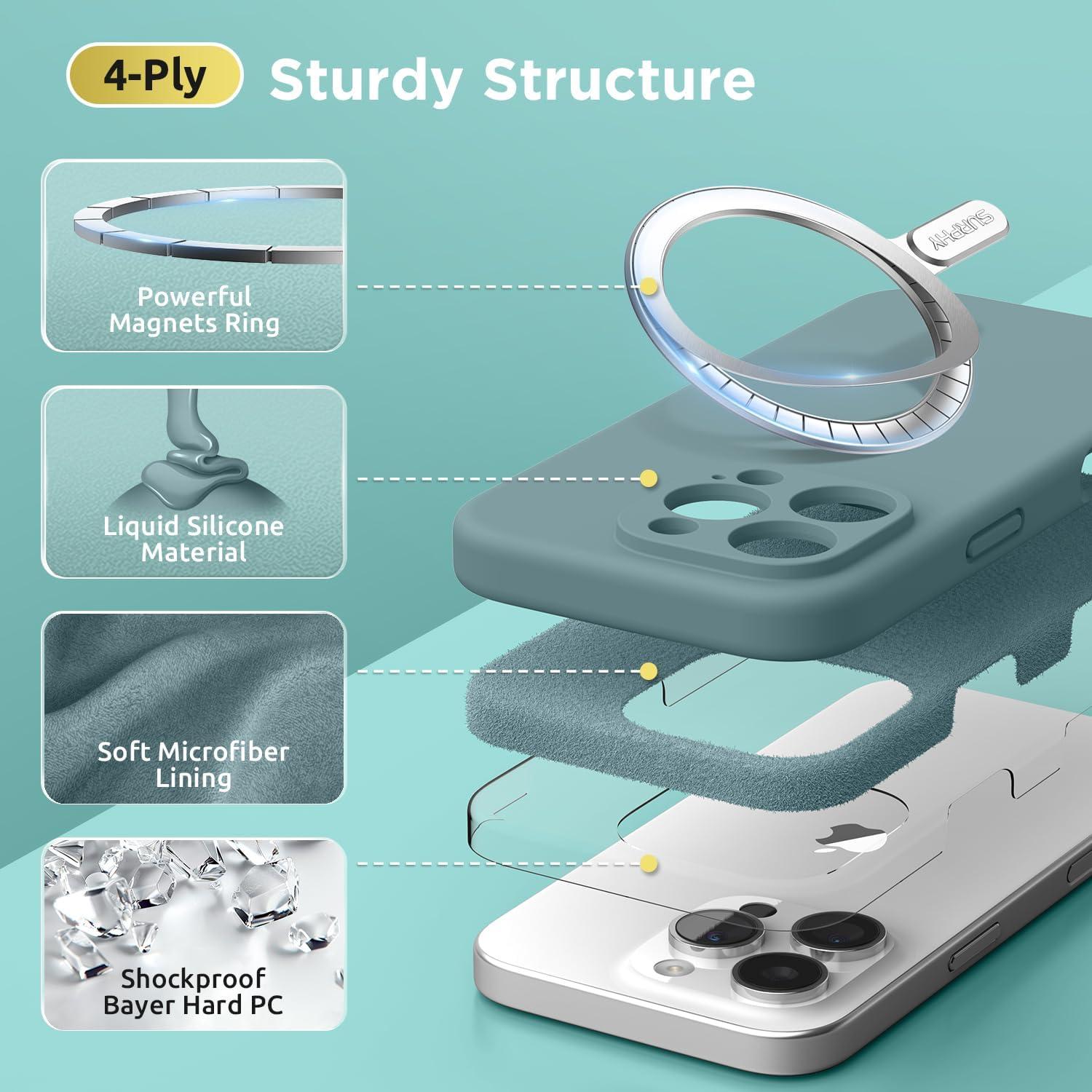 SURPHY Designed for iPhone 16 Case Compatible with MagSafe (6.1 inch 2024), with Screen Protector Liquid Silicone Phone Case (Camera Protective, Soft Microfiber Lining), Black(Lake Green)