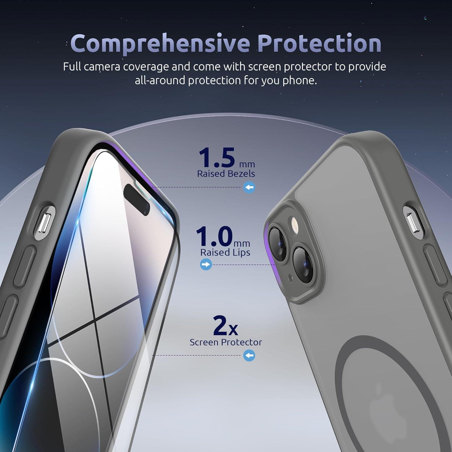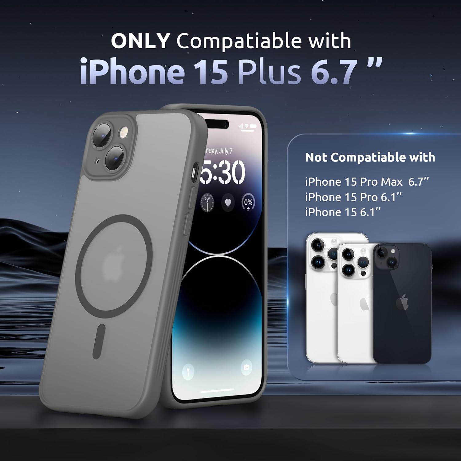 SURPHY Made for iPhone 15 Plus Case Compatible with MagSafe, and Screen Protector 2 Pack, Translucent Matte Phone Case with Camera Protective 6.7 inch 2023, Black(Gray)