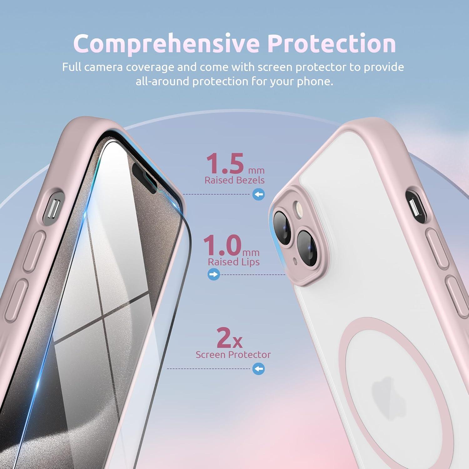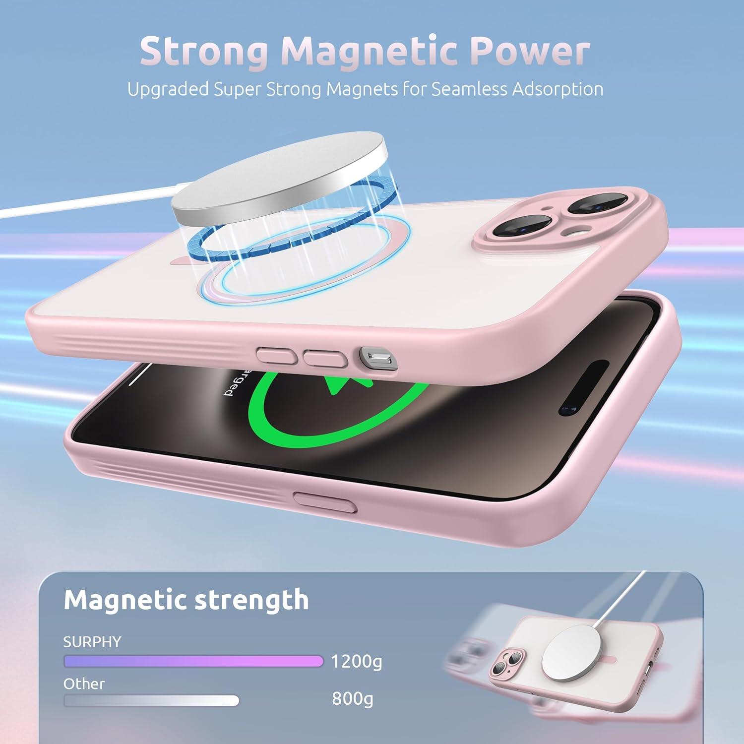 SURPHY Made for iPhone 15 Case Compatible with MagSafe, and Screen Protector 2 Pack, Translucent Matte Phone Case with Camera Protective 6.1 inch 2023, Black(Pink)
