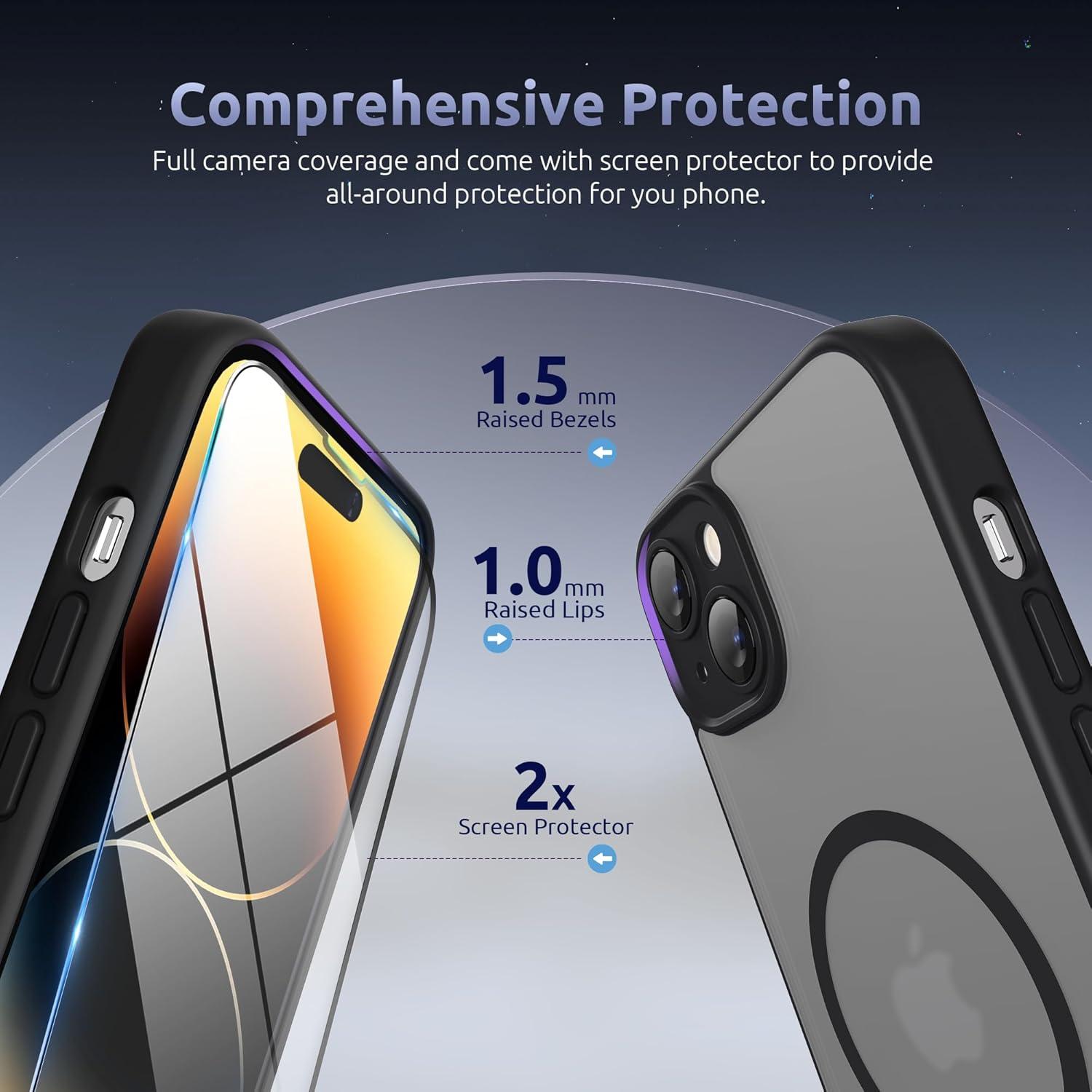 SURPHY Made for iPhone 15 Plus Case Compatible with MagSafe, and Screen Protector 2 Pack, Translucent Matte Phone Case with Camera Protective 6.7 inch 2023, Black(Black)