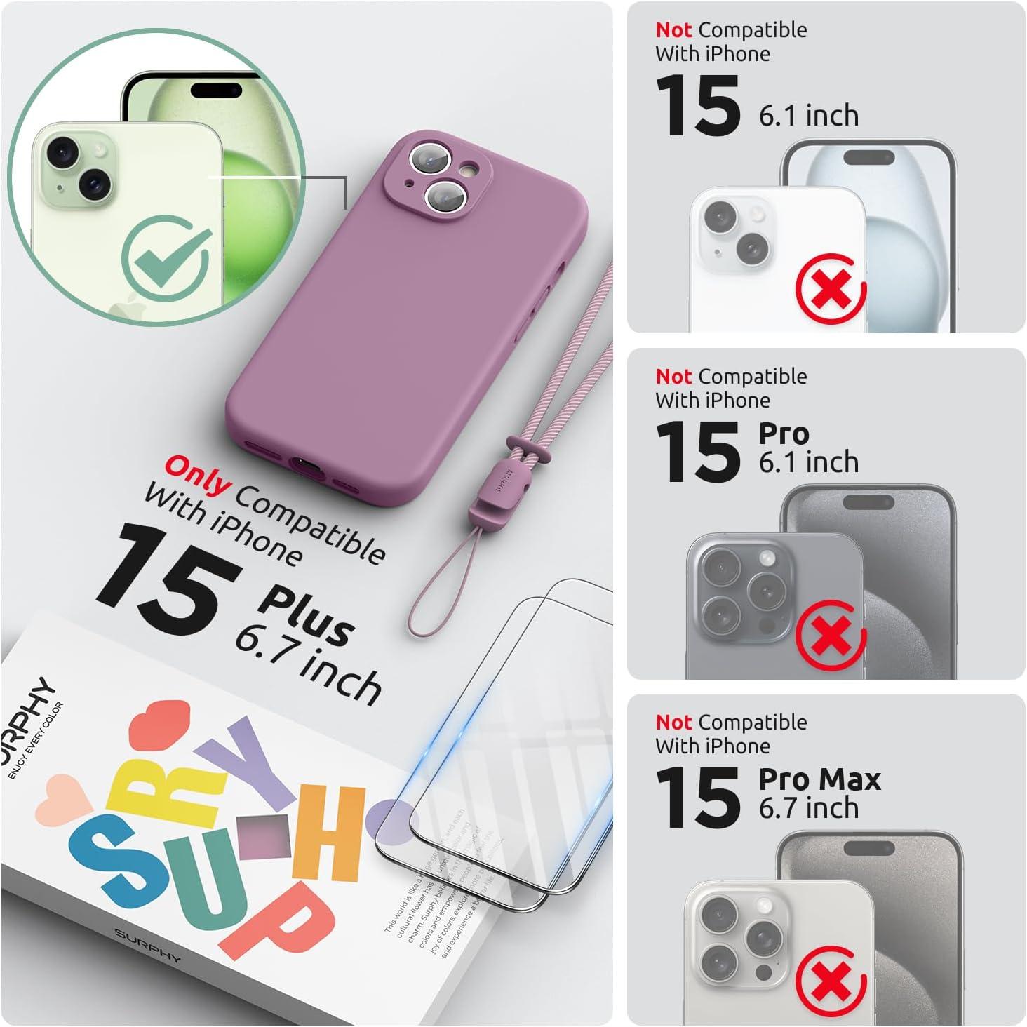 SURPHY Designed for iPhone 15 Plus Case with Screen Protector and Lanyard, Phone Strap and Liquid Silicone Phone Case (Camera Protective & Soft Microfiber Lining) 6.7 inch 2023, Lilac Purple(Space Gray)