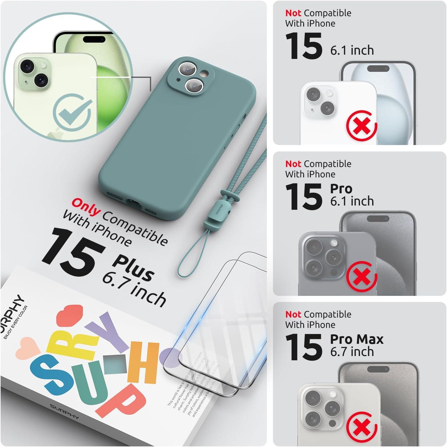 SURPHY Designed for iPhone 15 Plus Case with Screen Protector and Lanyard, Phone Strap and Liquid Silicone Phone Case (Camera Protective & Soft Microfiber Lining) 6.7 inch 2023, Black(Cactus Green)