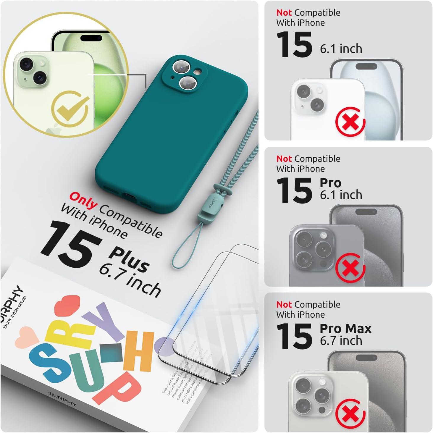 SURPHY Designed for iPhone 15 Plus Case with Screen Protector and Lanyard, Phone Strap and Liquid Silicone Phone Case (Camera Protective & Soft Microfiber Lining) 6.7 inch 2023, Black(Teal Blue)