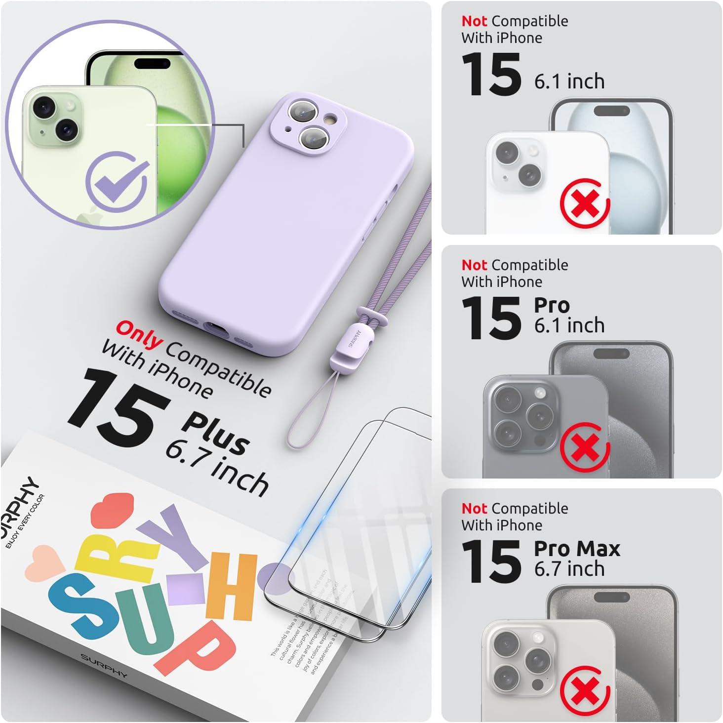 SURPHY Designed for iPhone 15 Plus Case with Screen Protector and Lanyard, Phone Strap and Liquid Silicone Phone Case (Camera Protective & Soft Microfiber Lining) 6.7 inch 2023, Lilac Purple(Lilac)