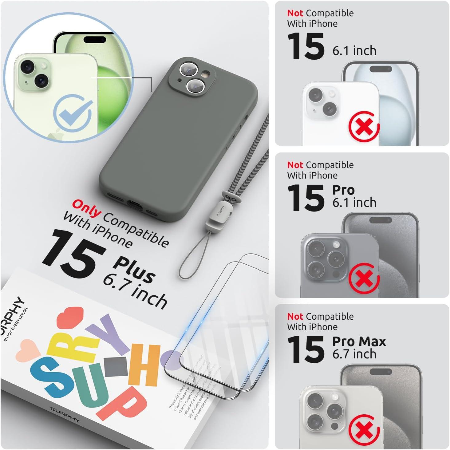 SURPHY Designed for iPhone 15 Plus Case with Screen Protector and Lanyard, Phone Strap and Liquid Silicone Phone Case (Camera Protective & Soft Microfiber Lining) 6.7 inch 2023, Black(Space Gray)