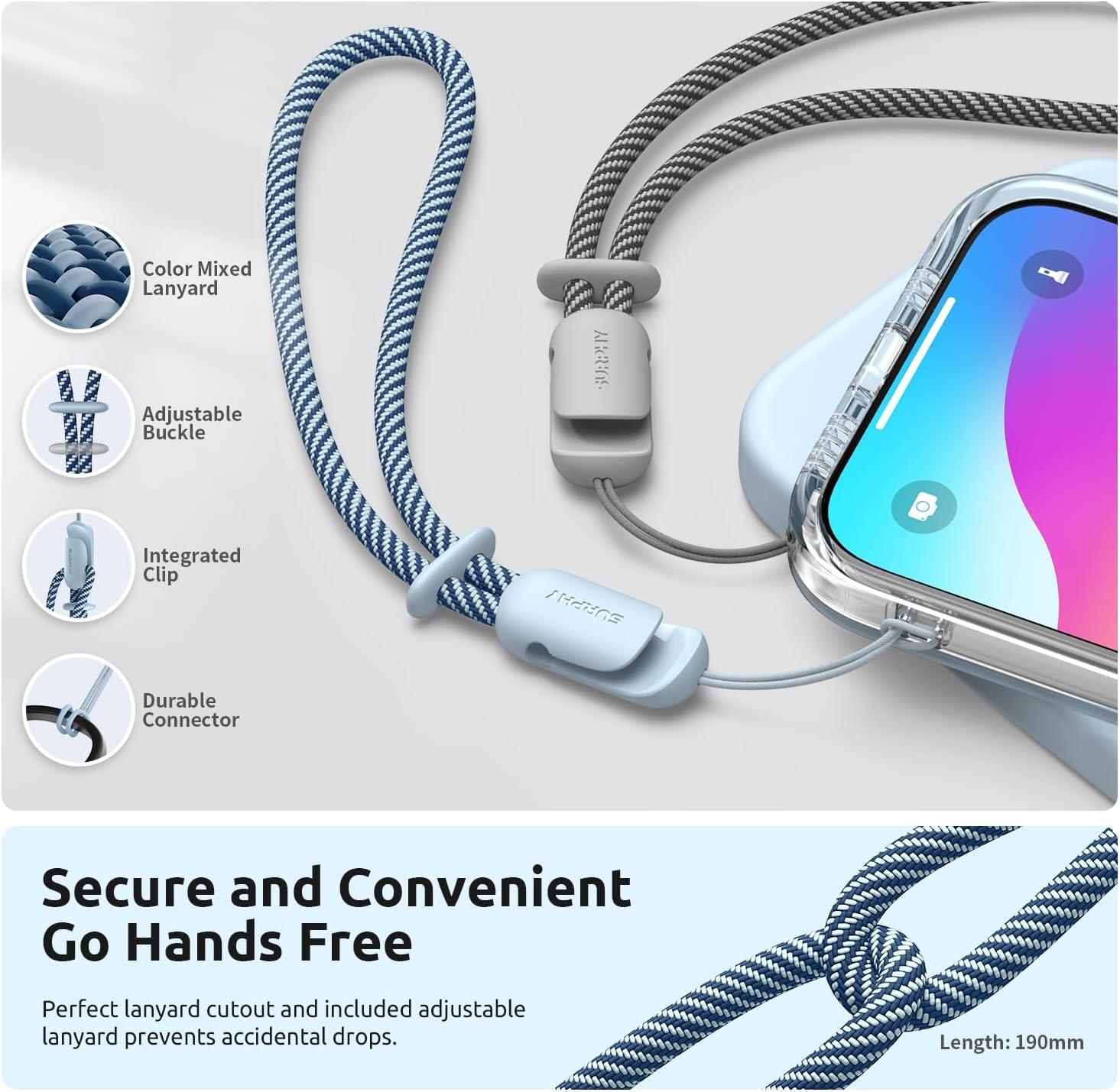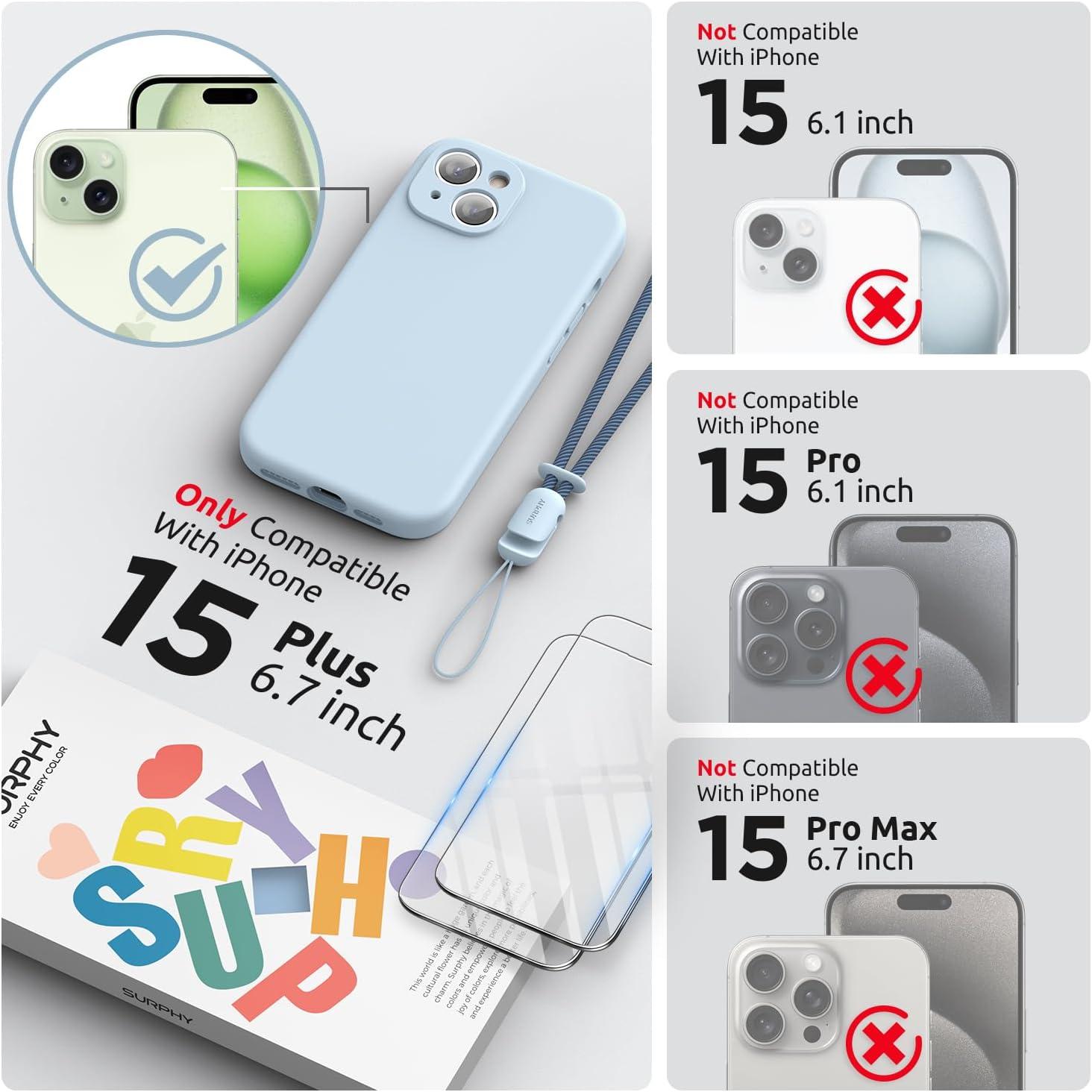 SURPHY Designed for iPhone 15 Plus Case with Screen Protector and Lanyard, Phone Strap and Liquid Silicone Phone Case (Camera Protective & Soft Microfiber Lining) 6.7 inch 2023, Black(Cloud Blue)