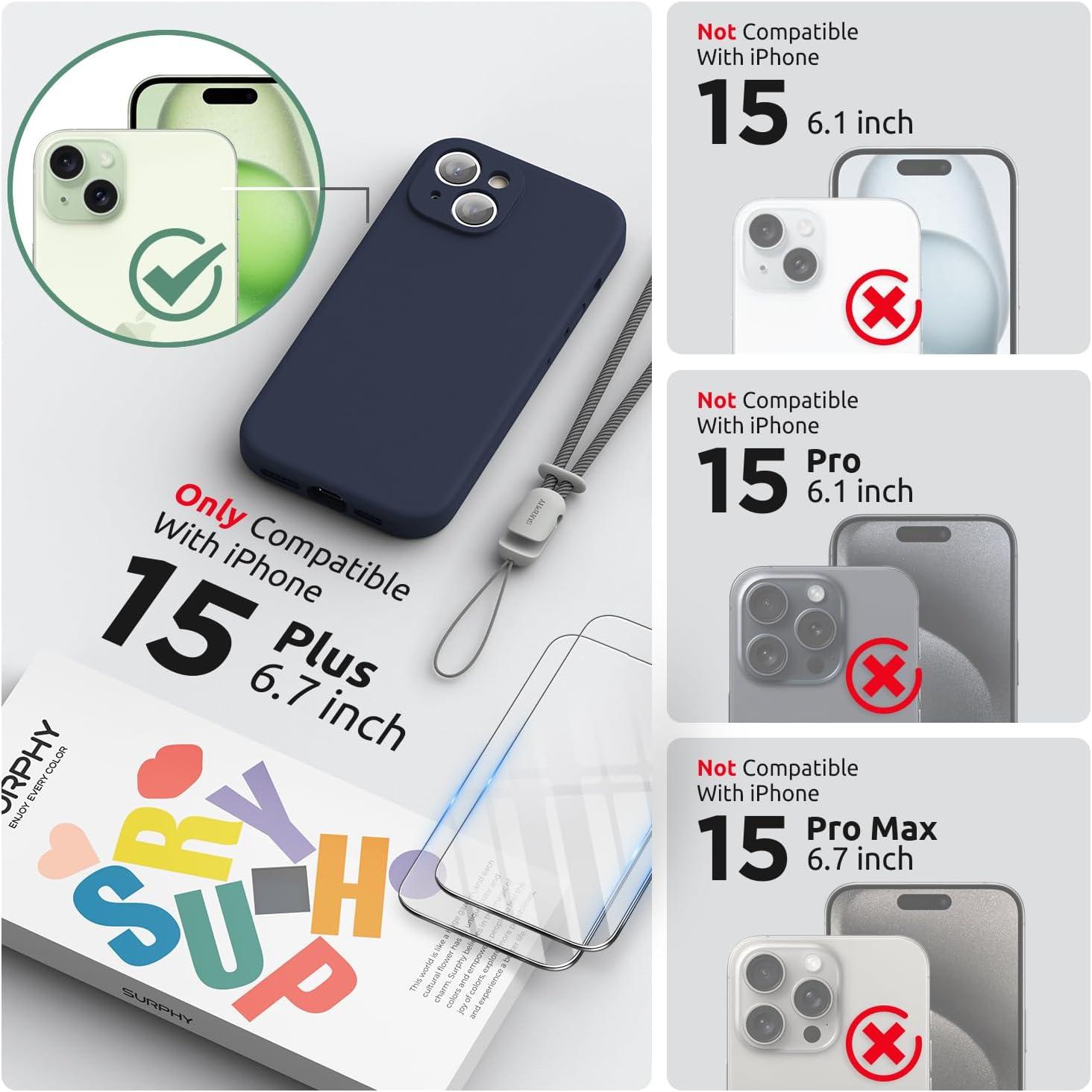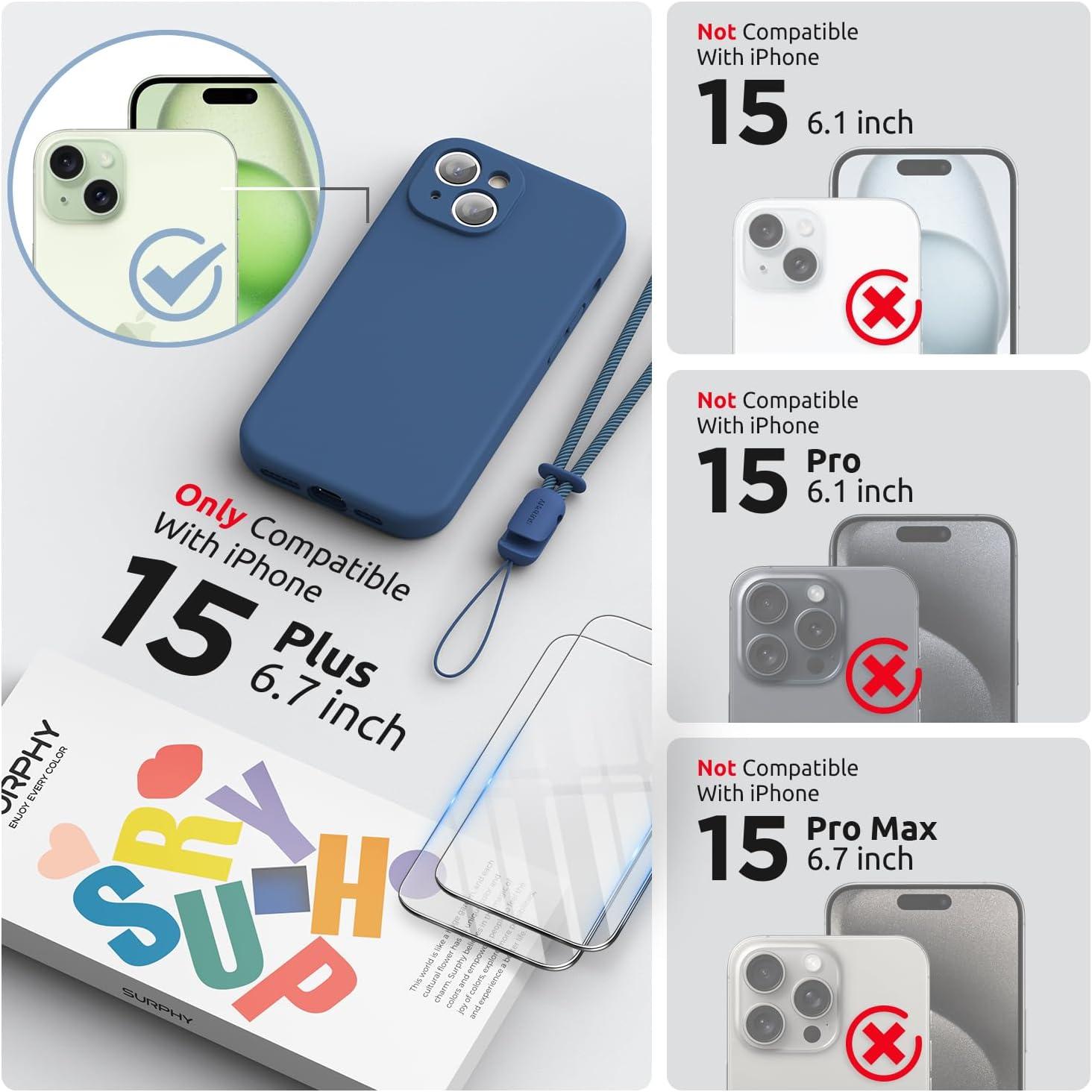 SURPHY Designed for iPhone 15 Plus Case with Screen Protector and Lanyard, Phone Strap and Liquid Silicone Phone Case (Camera Protective & Soft Microfiber Lining) 6.7 inch 2023, Black(Midnight Blue)