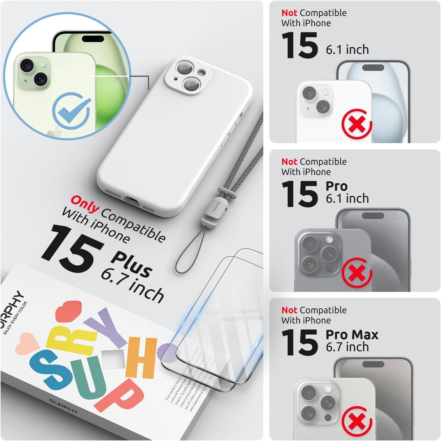 SURPHY Designed for iPhone 15 Plus Case with Screen Protector and Lanyard, Phone Strap and Liquid Silicone Phone Case (Camera Protective & Soft Microfiber Lining) 6.7 inch 2023, Black(White)