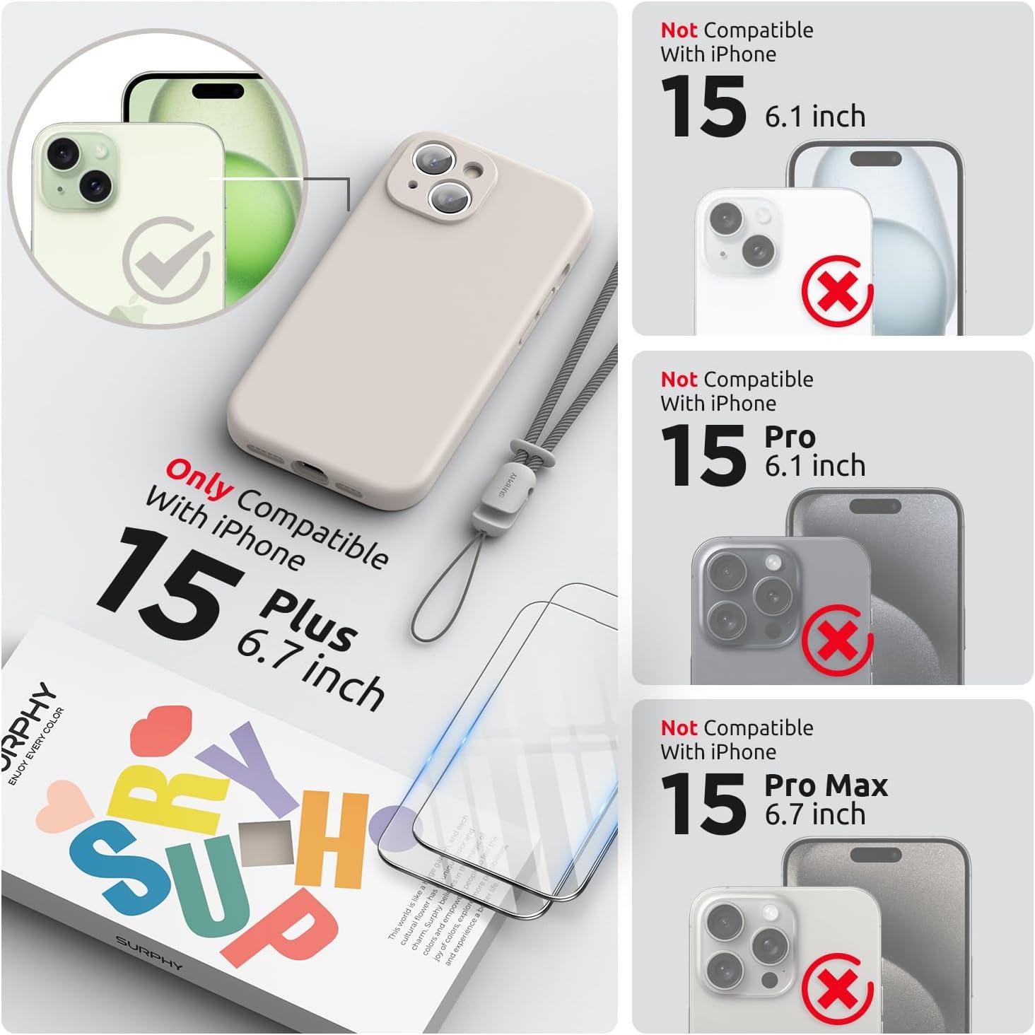 SURPHY Designed for iPhone 15 Plus Case with Screen Protector and Lanyard, Phone Strap and Liquid Silicone Phone Case (Camera Protective & Soft Microfiber Lining) 6.7 inch 2023, Black(Stone)