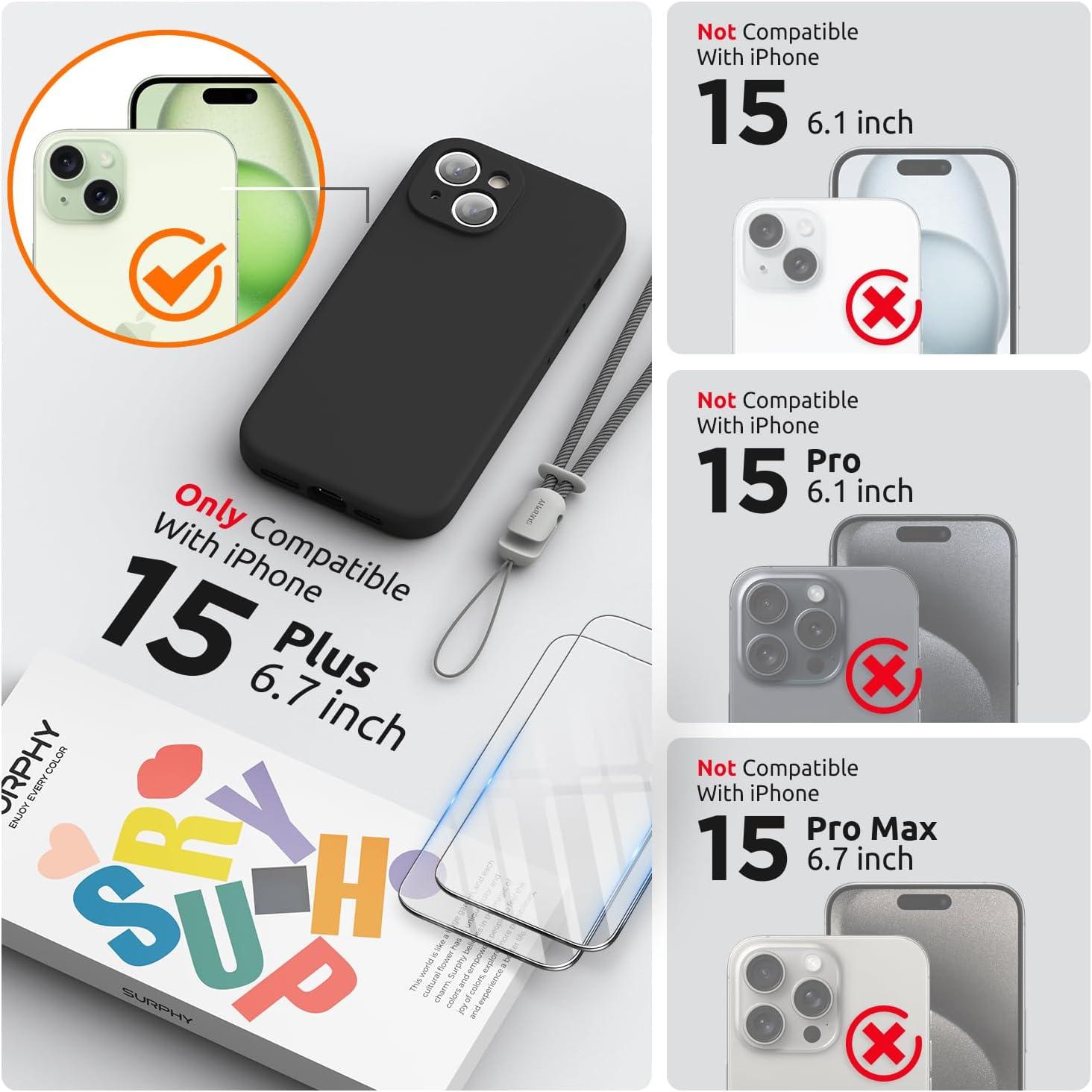 SURPHY Designed for iPhone 15 Plus Case with Screen Protector and Lanyard, Phone Strap and Liquid Silicone Phone Case (Camera Protective & Soft Microfiber Lining) 6.7 inch 2023, Black(Black)