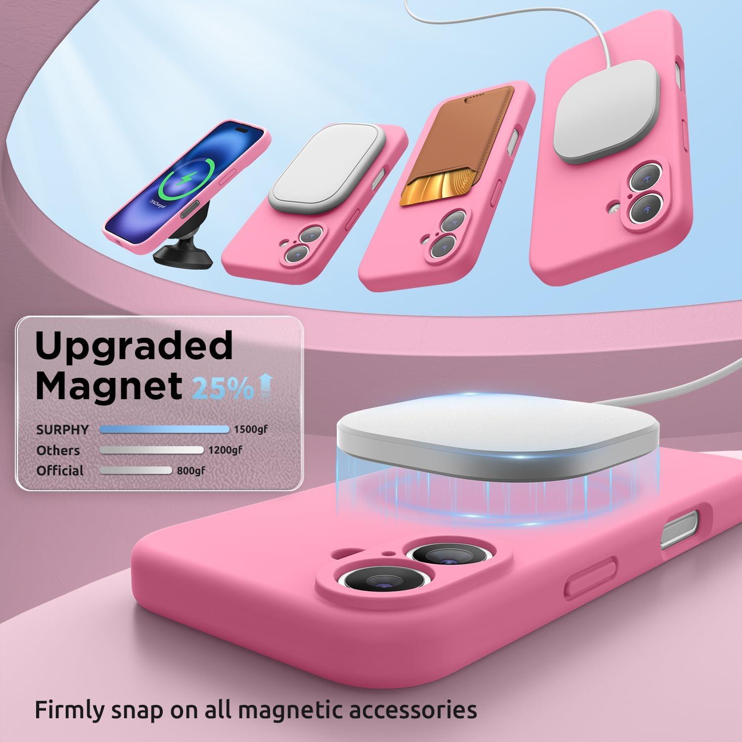 SURPHY Designed for iPhone 16 Plus Case Compatible with MagSafe (6.7 inch 2024), with Screen Protector Liquid Silicone Phone Case (Camera Protective, Soft Microfiber Lining), Soft Mint(Pink)