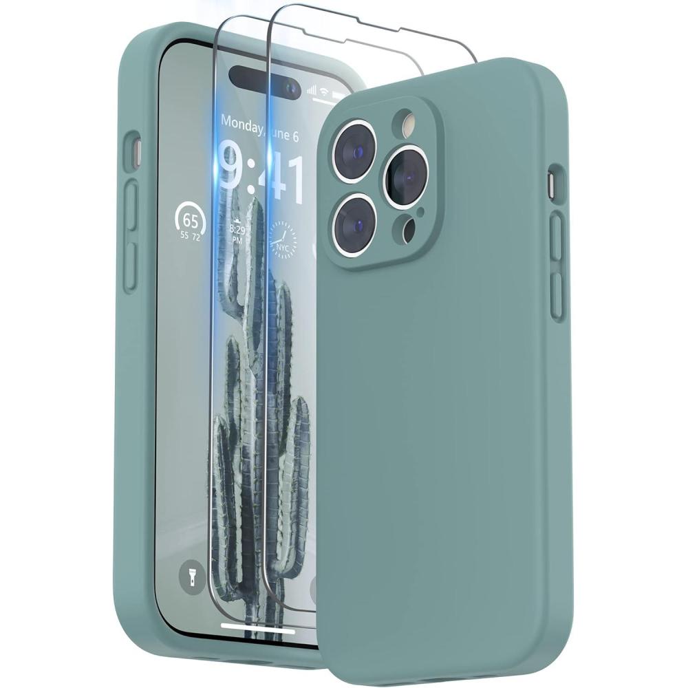 SURPHY Designed for iPhone 14 Pro Case with Screen Protector, (Camera Protection & Soft Microfiber Lining) Liquid Silicone Phone Case, Cloud Blue(Cactus Green)