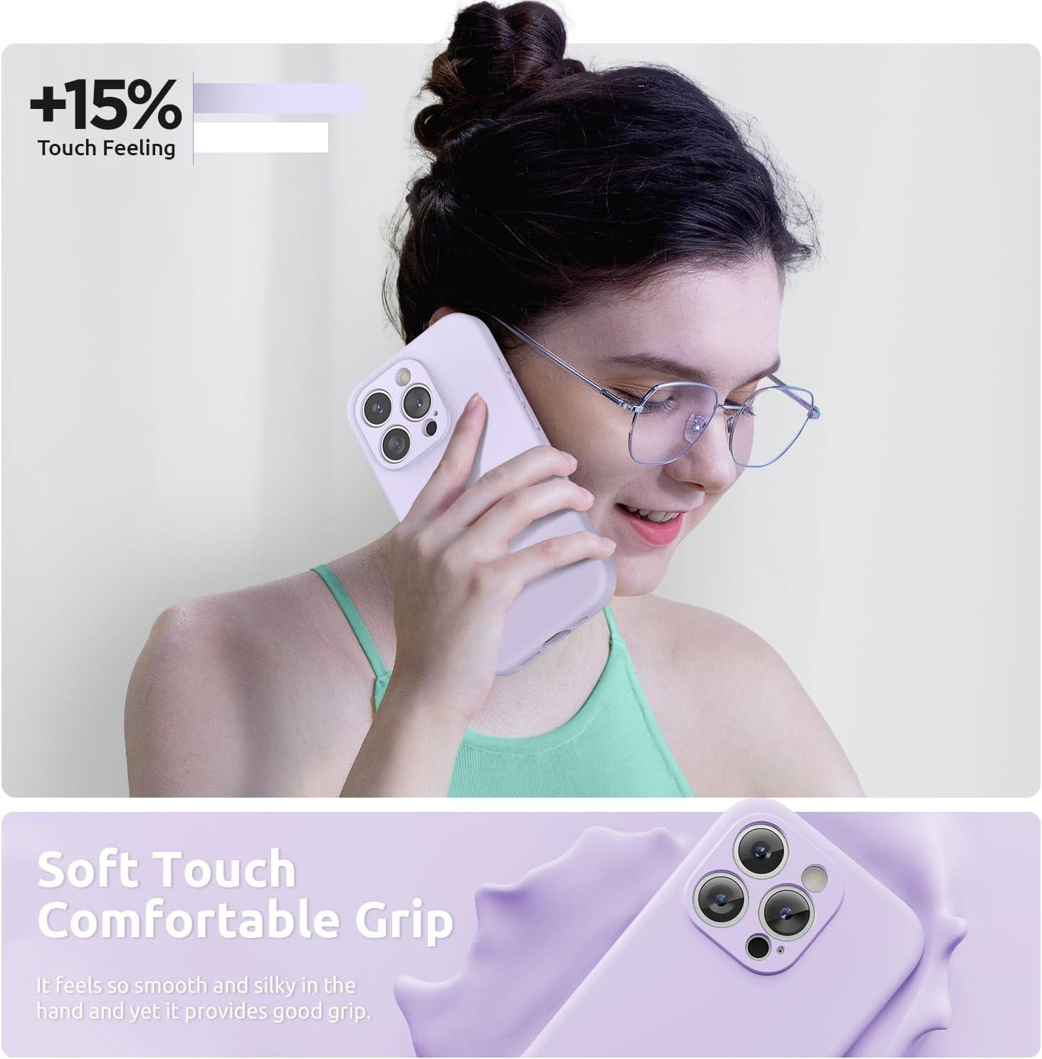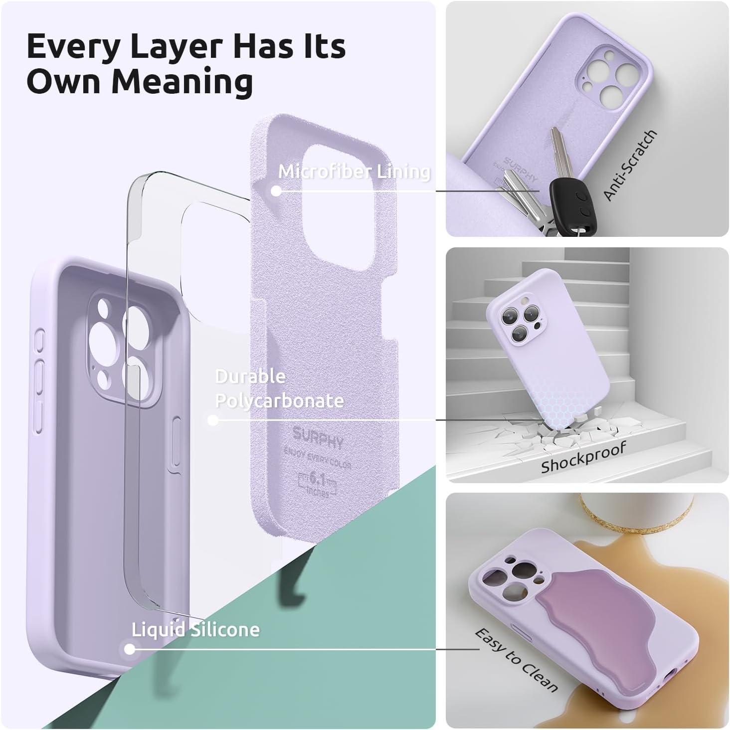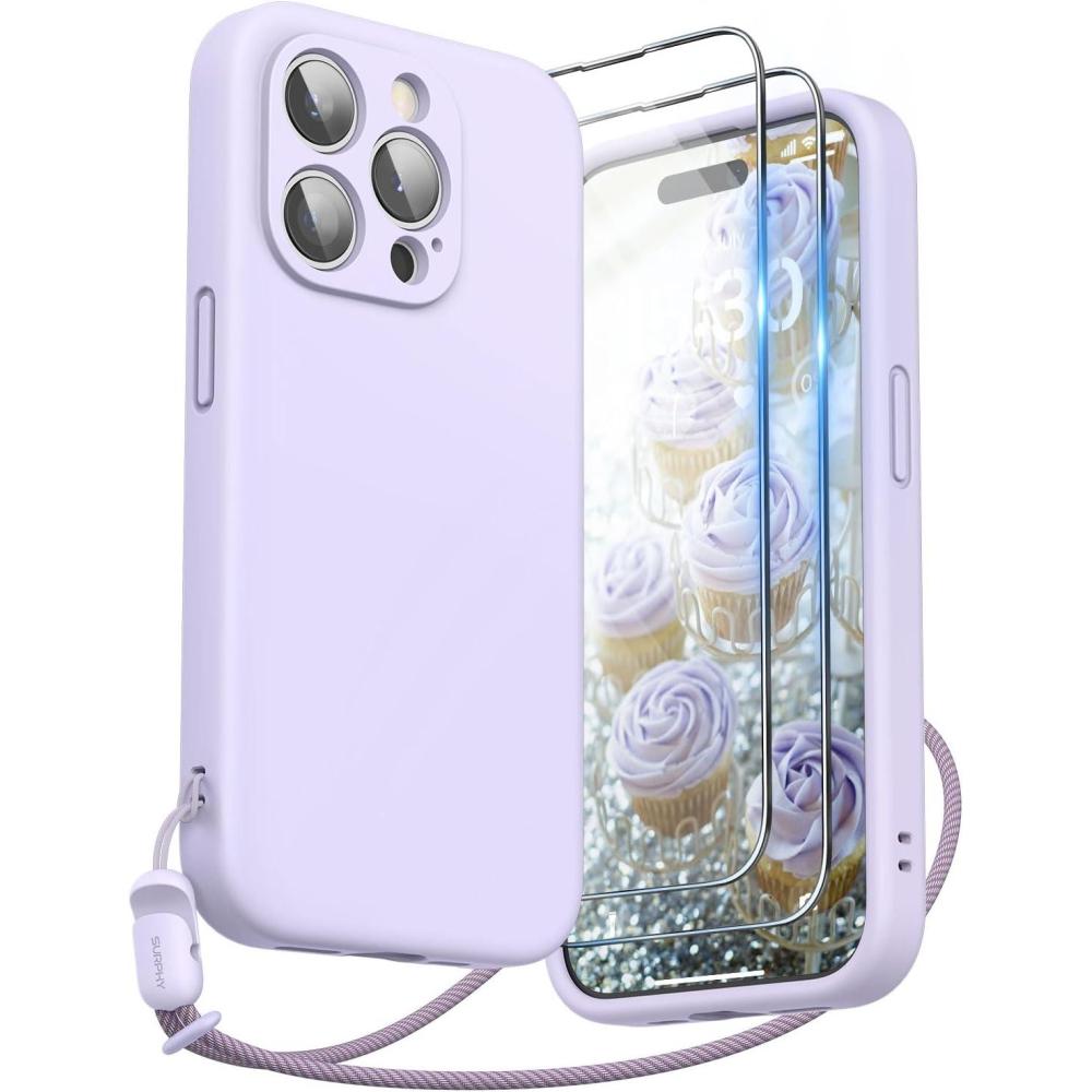 SURPHY Designed for iPhone 15 Pro Case with Screen Protector and Lanyard, Phone Strap and Liquid Silicone Phone Case (Camera Protective & Soft Microfiber Lining) 6.1 inch 2023, Lilac Purple(Lilac)